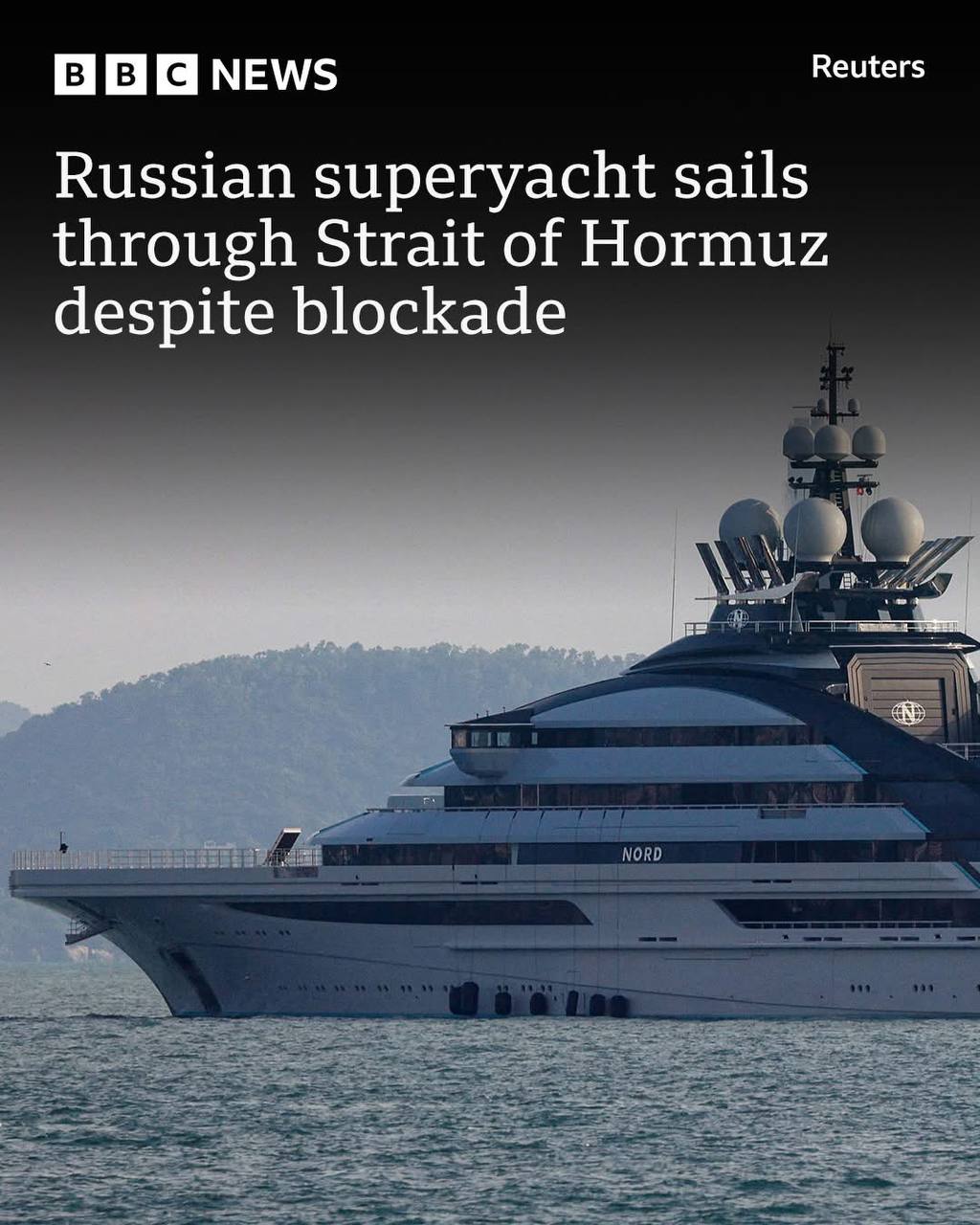 ទូកប្រណីត Nord ដែលមានប្រវែង 142 ម៉ែត្រ (465 ហ្វីត) ដែលមានទំនាក់ទំនងជាមួយមហាសេដ្ឋីរុស្ស៊ីដែលត្រូវបានទណ្ឌកម្ម Alexey Mordashov បានធ្វើដំណើរពីទីក្រុងឌូបៃទៅកាន់ទីក្រុង Muscat ប្រទេសអូម៉ង់កាលពីចុងសប្តាហ៍ ដែលជានាវាឯកជនមួយក្នុងចំណោមនាវាឯកជនមួយចំនួនដែលបានឆ្លងកាត់ច្រកសមុទ្រក្នុងរយៈពេលប៉ុន្មានខែថ្មីៗនេះ។