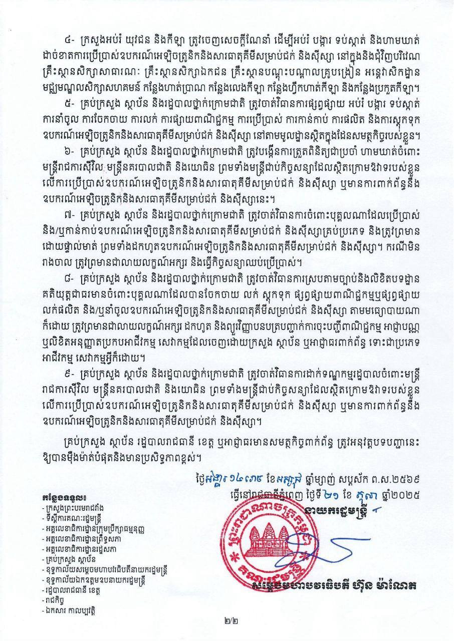 ២- ក្រសួងមហាផ្ទៃ ក្រសួងសេដ្ឋកិច្ចនិងហិរញ្ញវត្ថុ ក្រសួងពាណិជ្ជកម្ម ក្រសួងព័ត៌មាន និងក្រសួងប្រៃសណីយ៍ និងទូរគមនាគមន៍ ត្រូវមានវិធានការទប់ស្កាត់ការនាំចូល ការចែកចាយ ការផ្សាយពាណិជ្ជកម្ម ការលក់ និង ការស្តុកទុកឧបករណ៍អេឡិចត្រូនិកនិងសារធាតុគីមីសម្រាប់ជក់ និងស៊ីស្សា។