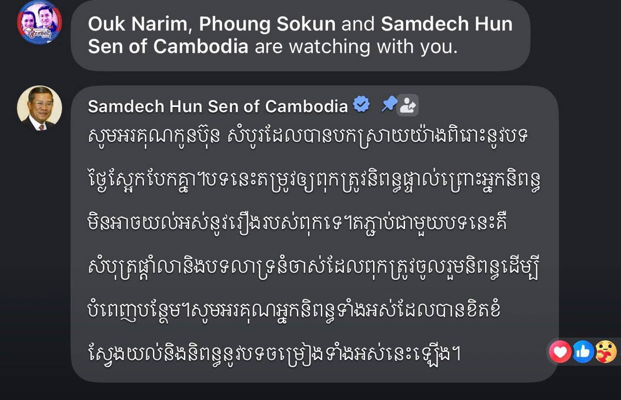 ភ្នំពេញ ៖ ការប្រកាសរបស់សម្តេចតេជោ ហ៊ុន សែន បានធ្វើឡើងតាមរយៈមតិនៅលើបណ្តាញសង្គមហ្វេសប៊ុក នៅយប់ថ្ងៃទី២៧ ខែមេសា ឆ្នាំ២០២៦ ពេលសម្តេចទស្សនាកម្មវិធីចម្រៀងគ្រួសារខ្មែរ។