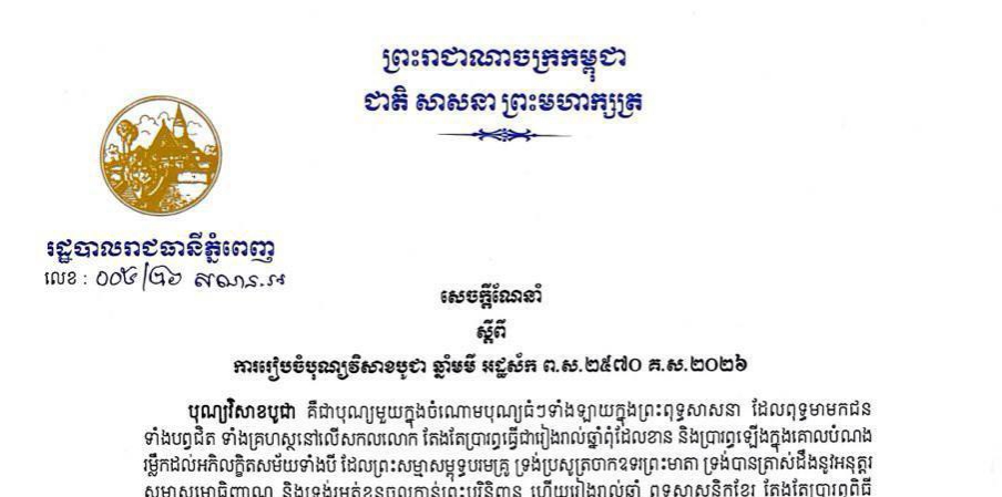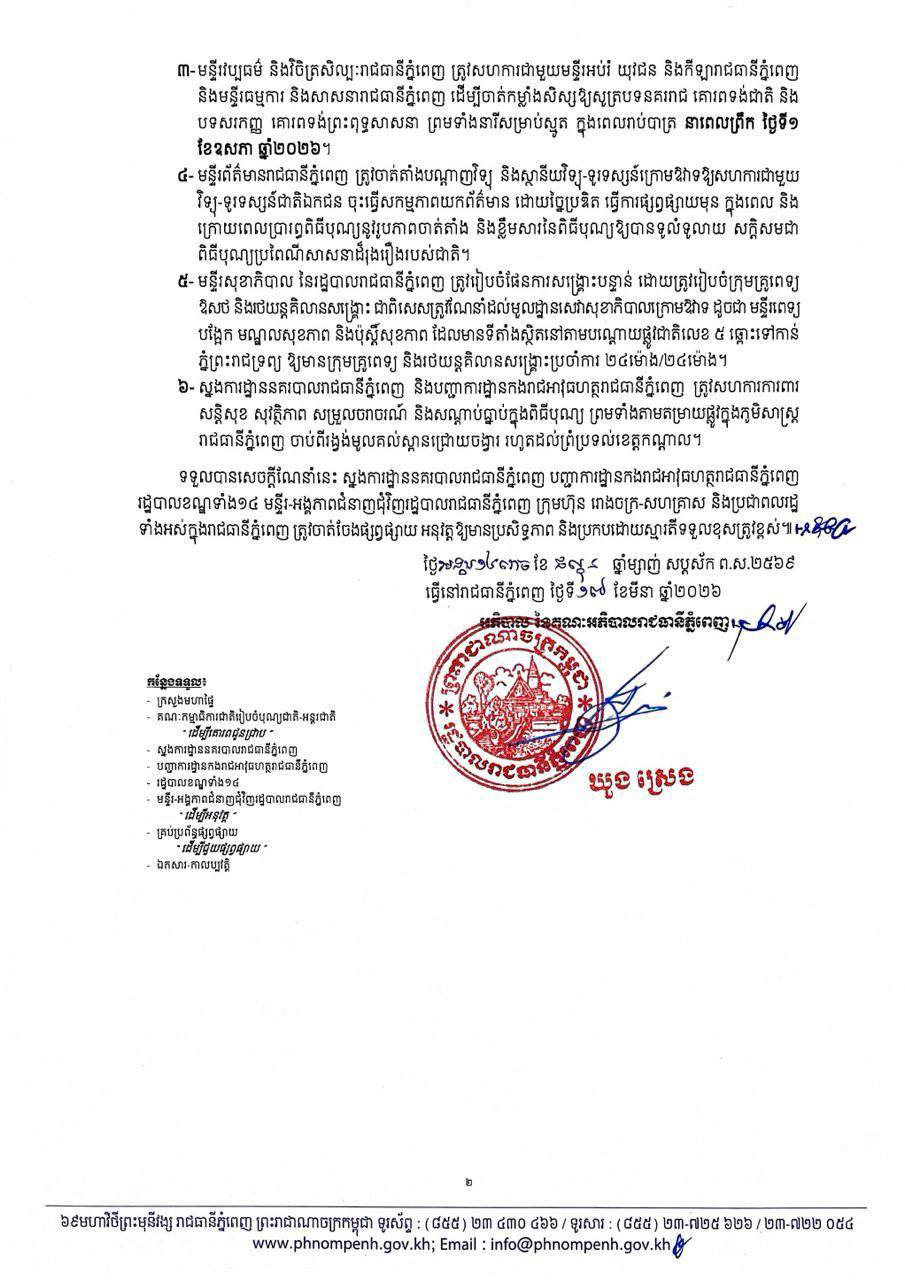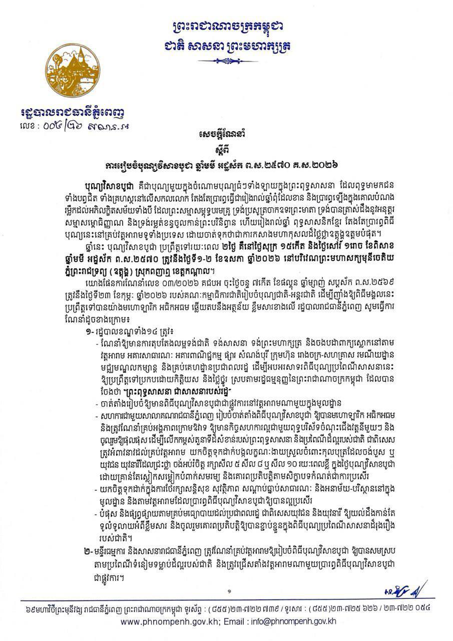 យោងផែនការណែនាំលេខ ០៣/២០២៦ គជបអ ចុះថ្ងៃចន្ទ ៧កើត ខែផល្គុន ឆ្នាំម្សាញ់ សប្តស័ក ព.ស.២៥៦៩ ត្រូវនឹងថ្ងៃទី២៣ ខែកុម្ភៈ ឆ្នាំ២០២៦ របស់គណៈកម្មាធិការជាតិរៀបចំបុណ្យជាតិ-អន្តរជាតិ ដើម្បីញ៉ាំងឱ្យពិធីមង្គលនេះ ប្រព្រឹត្តទៅបានយ៉ាងមហោឡារិក អធិកអធម ឆ្លើយតបនឹងអត្ថន័យ ខ្លឹមសារខាងលើ រដ្ឋបាលរាជធានីភ្នំពេញ សូមធ្វើការ ណែនាំដូចខាងក្រោម៖ ១- រដ្ឋបាលខណ្ឌទាំង១៤ ត្រូវ៖ -ណែនាំឱ្យមានការតុបតែងលម្អទង់ជាតិ ទង់សាសនា ទង់ព្រះមហាក្សត្រ និងចងបដាពាក្យស្លោកនៅតាម វត្តអារាម អគារសាធារណៈ អគារពាណិជ្ជកម្ម ផ្សារ សំណង់បុរី ក្រុមហ៊ុន រោងចក្រ-សហគ្រាស រមណីយដ្ឋាន មជ្ឈមណ្ឌលកម្សាន្ត និងគ្រប់គេហដ្ឋានប្រជាពលរដ្ឋ ដើម្បីអបអរសាទរពិធីបុណ្យប្រពៃណីសាសនានេះ ឱ្យប្រព្រឹត្តទៅប្រកបដោយកិត្តិយស និងថ្លៃថ្នូរ ស្របតាមរដ្ឋធម្មនុញ្ញនៃព្រះរាជាណាចក្រកម្ពុជា ដែលបាន ចែងថា “ព្រះពុទ្ធសាសនា ជាសាសនារបស់រដ្ឋ” ចាត់តាំងរៀបចំឱ្យមានពិធីបុណ្យវិសាខបូជាជាផ្លូវការនៅវត្តអារាមណាមួយក្នុងមូលដ្ឋាន -សហការជាមួយសាលាគណរាជធានីភ្នំពេញ រៀបចំចាត់តាំងពិធីបុណ្យវិសាខបូជា ឱ្យបានមហោឡារិក អធិកអធម និងត្រូវណែនាំគ្រប់អង្គភាពក្រោមឱវាទ ឱ្យមានកិច្ចសហការល្អជាមួយពុទ្ធបរិស័ទចំណុះជើងវត្តនីមួយៗ និង ចូលរួមឱ្យផុលផុស ដើម្បីលើកកម្ពស់តួនាទីដ៏សំខាន់របស់ព្រះពុទ្ធសាសនា និងប្រពៃណីដ៏ល្អរបស់ជាតិ ជាពិសេស ត្រូវអំពាវនាវដល់គ្រប់វត្តអារាម យកចិត្តទុកដាក់បង្កលក្ខណៈងាយស្រួលចំពោះកុលបុត្រដែលចង់បួស ឬ យុវជន យុវនារីដែលជ្រះថ្លា ចង់អប់រំចិត្ត រក្សាសីល ៥ សីល ៨ ឬ សីល ១០ រយៈពេលខ្លី ក្នុងថ្ងៃបុណ្យវិសាខបូជា ដោយគ្រាន់តែស្លៀកសម្លៀកបំពាក់សមរម្យ និងគោរពប្រតិបត្តិតាមសិក្ខាបទកំណត់ជាការប្រសើរ ។ – យកចិត្តទុកដាក់ក្នុងការថែរក្សាសន្តិសុខ សុវត្ថិភាព សណ្តាប់ធ្នាប់សាធារណៈ និងអនាម័យ-បរិស្ថាននៅក្នុង មូលដ្ឋាន និងតាមវត្តអារាមដែល ប្រារព្ធពិធីបុណ្យវិសាខបូជាឱ្យបានល្អប្រសើរ ។-បំផុស និងផ្សព្វផ្សាយតាមគ្រប់មធ្យោបាយដល់ប្រជាពលរដ្ឋ ជាពិសេសយុវជន និងយុវនារី ឱ្យយល់ដឹងកាន់តែ ទូលំទូ លាយអំពីខ្លឹមសារ និងចូលរួមគោរពប្រតិបត្តិឱ្យបានខ្ជាប់ខ្ជួនក្នុងពិធីបុណ្យប្រពៃណីសាសនាដ៏រុងរឿងរបស់ជាតិ។ ២- មន្ទីរធម្មការ និងសាសនារាជធានីភ្នំពេញ ត្រូវណែនាំគ្រប់វត្តអារាមឱ្យរៀបចំពិធីបុណ្យវិសាខបូជា ឱ្យបានសមស្រប តាមប្រពៃណីទំនៀមទម្លាប់ដ៏ល្អរបស់ជាតិ ៕