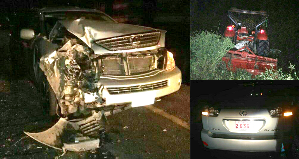 លោក អនុសេនីយ៍ទោ ខៀវ សុខា នាយប៉ុស្តិ៍នគរបាលរដ្ឋបាលក្បាលត្រាចបានឲ្យដឹងថា រថយន្តបង្កម៉ាកឡិចស៊ីសRX400 ពណ៌ស ពាក់ស្លាកលេខអន្តោប្រវេសន៍នៃក្រសួងមហាផ្ទៃ និងអ្នករួមដំណើរ២នាក់ទៀត ទី១ ឈ្មោះ អ៊ុង ចាន់ធួក ភេទស្រី អាយុ៤៧ឆ្នាំ និងទី២ ឈ្មោះ ប៊ុន សុគន្ធនី ភេទស្រី អាយុ៤៨ឆ្នាំ ស្រ្តីទាំង២នាក់ រស់នៅរាជធានីភ្នំពេញ ប៉ុន្តែអ្នកទាំង៣នាក់ មិនបណ្តាលឲ្យអ្នកណាម្នាក់រងរបួសធ្ងន់នោះទេ ធ្វើដំណើរក្នុងទិសដៅពីកើតទៅលិច លុះមកដល់ចំណុចកើតហេតុ បានបុកត្រាក់ទ័រពីក្រោយពេញទំហឹង បណ្ដាលឲ្យត្រាក់ទ័រម៉ាក គូបូតា ពណ៌ក្រហម ធ្លាក់ចូលស្នាមភ្លោះតែម្តង និងរងរបួសអ្នករួមដំណើរផងដែរ ។
