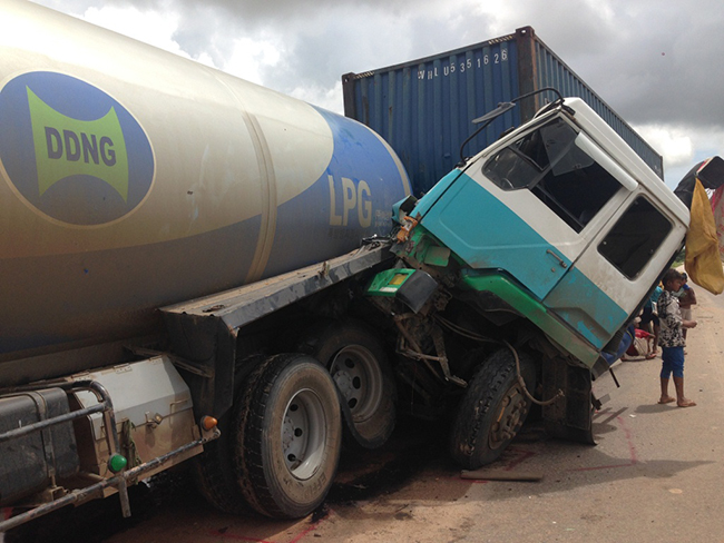 ខេត្តព្រៃវែង៖ រថយន្តកុងតឺន័របុករថយន្តដឹកហ្គាសយីហោDong ពីក្រោយបណ្តាលឲ្យរថយន្តកុងតឺន័រខូចយ៉ាងដំណំ តែមិនបណ្តាលឲ្យរងរបួសដល់អាយុជីវិតមនុស្សឡើយ។