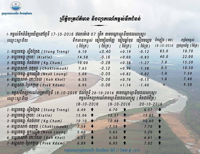 ក្រសួងធនធានទឹក៖ ព្រឹត្តិបត្រព័ត៌មាន និងព្យាករណ៍កម្ពស់ទឹកជំនន់ សម្រាប់ថ្ងៃទី ១៧ ខែតុលា ឆ្នាំ ២០១៦៖