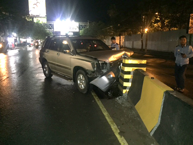 ភ្នំពេញ៖ របាំងថ្មពុះចែកទ្រូងផ្លូវចំនួន៣កង់បានរងខូចខាតដោយសារតែរថយន្តហាយឡែនឌ័រមួយគ្រឿងបើកក្នុងល្បឿនលឿនជ្រុលបុកពេញទំហឹងគៀបជាប់ទៅមុខលែងរួច កាលពីវេលាម៉ោង១០ និង៣០នាទីយប់ថ្ងៃទីខែតុលា ឆ្នាំ២០១៦ នៅចំណុចមុខក្រុមហ៊ុនស្រាបៀរអង្គរ តាមបណ្តោយផ្លូវមហាវិថីសហព័ន្ធរុស្ស៊ី ស្ថិតក្នុងសង្កាត់កាកាប ខណ្ឌពោធិ៍សែនជ័យ។