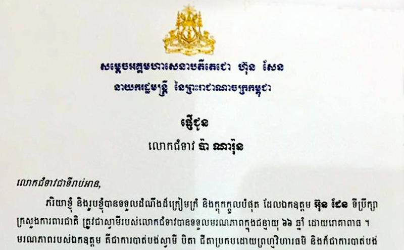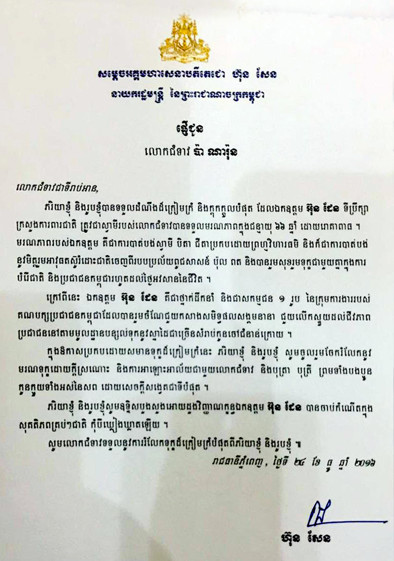 ព័ត៌មានថ្មី សម្តេចតេជោ ហ៊ុន សែន ផ្ញើសារលិខិតរំលែកទុក្ខដល់ស្វាមីលោកស្រី ប៉ា ណារ៉ុន ទទួលមរណភាព ចែករំលែក៖ភ្នំពេញ៖ នៅរសៀលថ្ងៃទី២៤ ខែធ្នូ ឆ្នាំ២០១៦សម្តេចតេជោ ហ៊ុន សែន នាយករដ្ឋមន្រ្តីកម្ពុជា បានផ្ញើសារចូលរួមរំលែកទុក្ខដល់លោកស្រី ប៉ា ណារ៉ុន ដែលស្វាមីលោក អ៊ុន ដែន ទីប្រឹក្សាក្រសួងការពារជាតិទទួលមរណភាព ក្នុងវ័យ៦៦ឆ្នាំ ដោយរោគាពាធ៕ ចែករំលែក៖