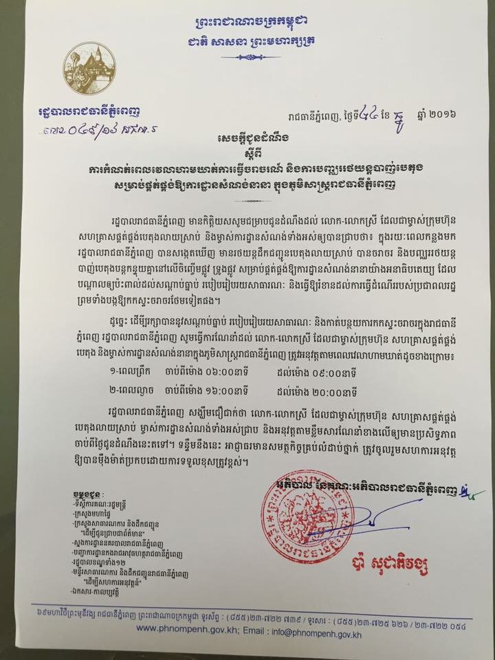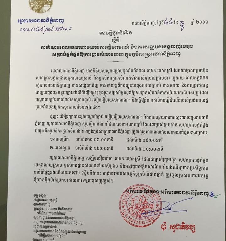 ព័ត៌មានថ្មី រដ្ឋបាលរាជធានីភ្នំពេញ ចេញសេចក្តីជូនដំណឹងហាមរថយន្តបេតុងលាយស្រេចចេញចូលពេលថ្ងៃពីម៉ោង ៦:០០ព្រឹកដល់ម៉ោង៩:០០ព្រឹក និងពីម៉ោង ១៦:០០រសៀលដល់ម៉ោង២០:០០យប់ ! ចែករំលែក៖ភ្នំពេញ ៖ រដ្ឋបាលរាជធានីភ្នំពេញ ចេញសេចក្តីជូនដំណឹងហាមរថយន្តបេតុងលាយស្រេចចេញចូលពេលថ្ងៃពីម៉ោង ៦:០០ព្រឹកដល់ម៉ោង៩:០០ព្រឹក និងពីម៉ោង ១៦:០០រសៀលដល់ម៉ោង២០:០០យប់ ។ សូមអានសេចក្ដីជូនដំណឹងដូចខាងក្រោម ៖ ... ចែករំលែក៖