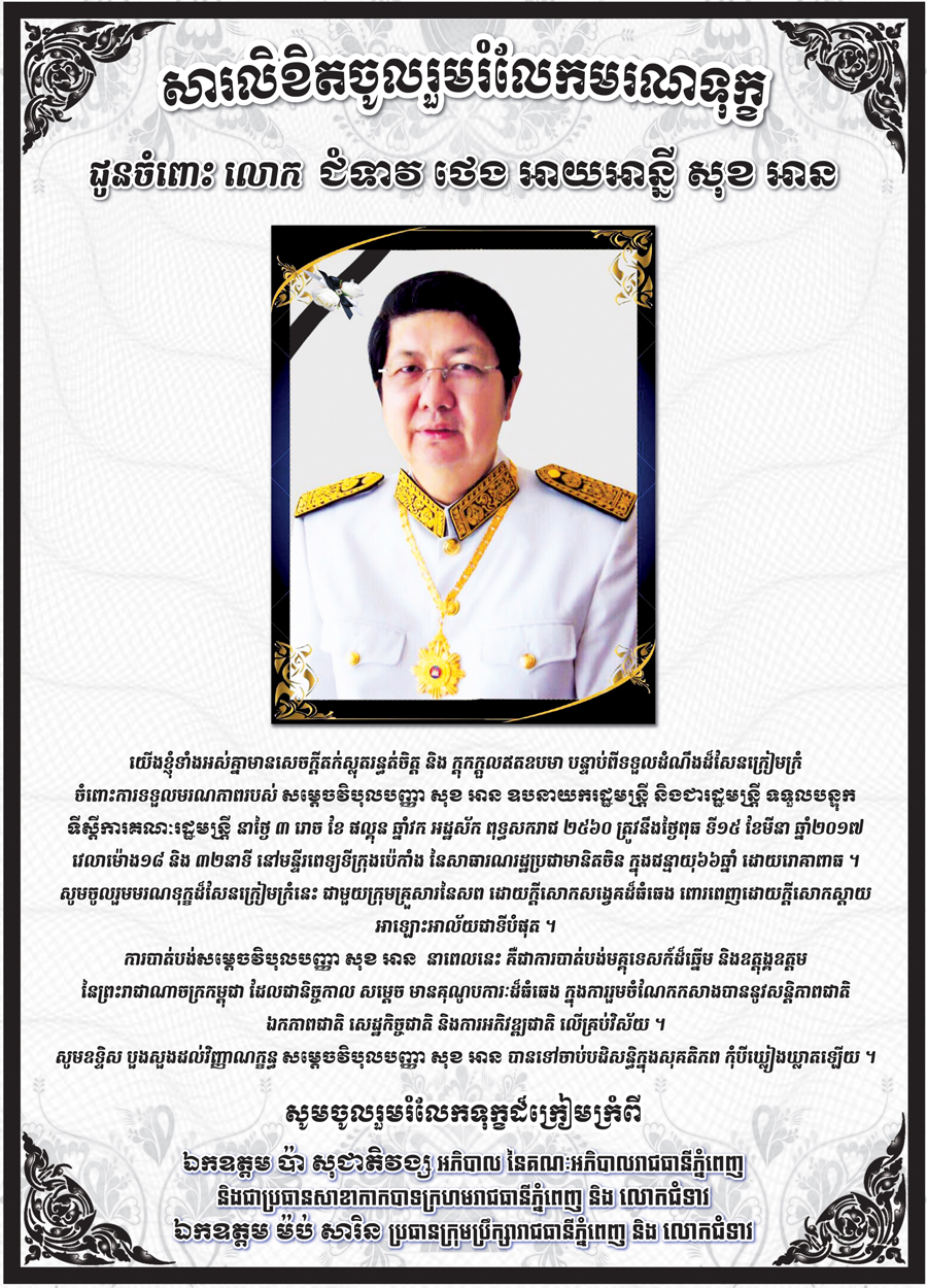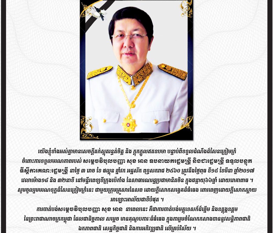 ភ្នំពេញ ៖ យើងខ្ញុំទាំងអស់គ្នាមានសេចក្តីតក់ស្លុតរន្ធត់ចិត្ត និង ក្តុកក្តួលឥតឧបមា បន្ទាប់ពីទទួលដំណឹងដ៏សែនក្រៀមក្រំ ចំពោះការទទួលមរណភាពរបស់សម្តេចវិបុលបញ្ញា សុខ អាន ឧបនាយករដ្ឋមន្រ្តី និងជារដ្ឋមន្រ្តី ទទួលបន្ទុកទីស្តីការគណៈរដ្ឋមន្រ្តី នាថ្ងៃ ៣ រោច ខែ ផល្គុន ឆ្នាំវក អដ្ឋស័ក ពុទ្ធសករាជ ២៥៦០ ត្រូវនឹងថ្ងៃពុធ ទី១៥ ខែមីនា ឆ្នាំ២០១៧ វេលាម៉ោង១៨ និង ៣២នាទី នៅមន្ទីរពេទ្យទីក្រុង ប៉េកាំង នៃសាធារណរដ្ឋប្រជាមានិតចិន ក្នុងជន្មាយុ៦៦ឆ្នាំ ដោយរោគាពាធ ។