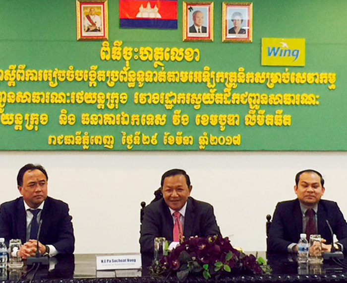 ភ្នំពេញ៖ រដ្ឋបាលរាជធានីភ្នំពេញ បានរៀបចំពិធីចុះហត្ថលេខា (MOU) លើកិច្ចសន្យាស្តីពីការរៀបចំបង្កើតប្រព័ន្ធទូទាត់តាមអេឡិចត្រូនិចសម្រាប់សេវាកម្មដឹកជញ្ជូនសាធារណៈរថយន្តក្រុង រវាងរដ្ឋាករស្វយ័តដឹកជញ្ជូនសាធារណៈរថយន្តក្រុង និងធនាគារឯកជន វីង ខេមបូឌា លីមីតធីត នារសៀលថ្ងៃទី២៩ ខែមីនា ឆ្នាំ២០១៧ នៅសាលារាជធានីភ្នំពេញ ។