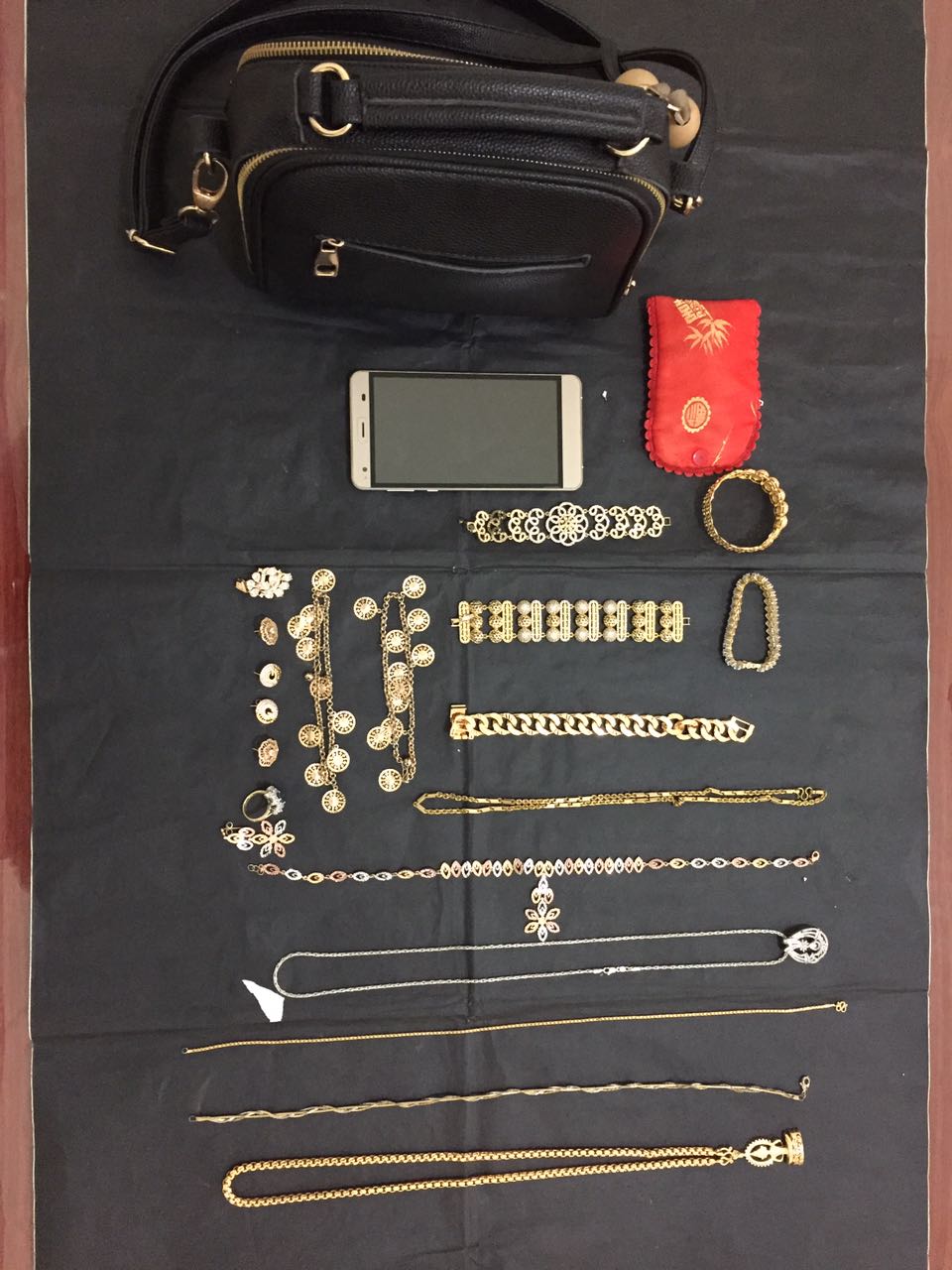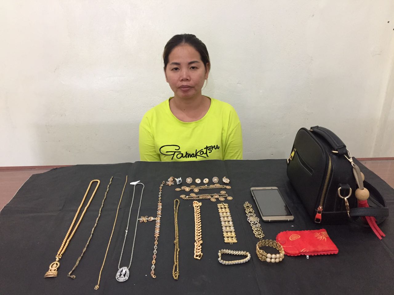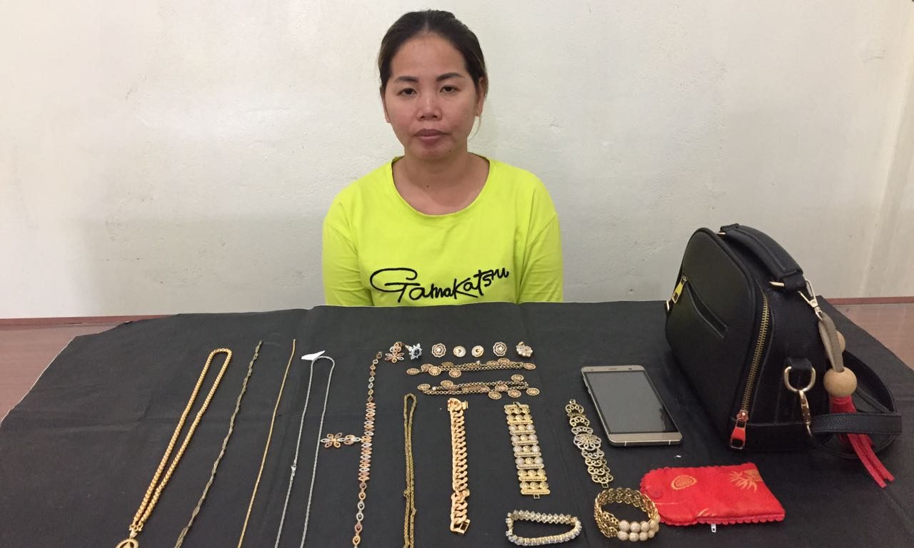 ក្នុងនោះកម្លាំងសមត្ថកិច្ចដកហូតបាន គ្រឿងអល័ង្កា ខ្សែកកាឡៃ ចំនួន ០៦ខ្សែ , ចិញ្ចៀនកាឡៃចំនួន០១វង់ ខ្សែជើងកាឡៃចំនួន០១គូ , ខ្សែដៃដាំត្បូងពណ៌ស កាឡៃចំនួន០១ខ្សែ ,ទូរស័ព្ទចល័តចំនួន០១គ្រឿង , ថង់ក្រណាត់ ពណ៌ក្រហមចំនួន១ , កាបូបស្ពាយចំនួន០១ ។