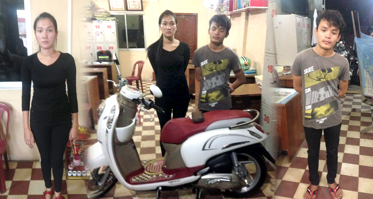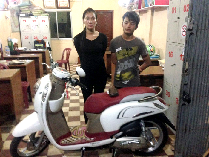 ភ្នំពេញ៖ ជនសង្ស័យប្រុសស្រី២នាក់ ត្រូវបានសមត្ថកិច្ចឃាត់ខ្លួនបានភ្លាមៗ បន្ទាប់ពីទទួលបានពាក្យបណ្តឹងពីនារីរងគ្រោះម្នាក់ អះអាងថា ពួកគេបានរៀបគំរោងវាយប្លន់យកម៉ូតូ និងកាបូបលុយរបស់នាងបានសម្រេច កាលពីវេលាម៉ោង១២និង៣០នាទីថ្ងៃទី៣០ ខែមីនា ឆ្នាំ២០១៧ ទុលមុខផ្ទះលេខ៨៦ ផ្លូវ៩៩ ភូមិ៤ក្រុម២៧ សង្កាត់ផ្សារដើមថ្កូវខណ្ឌចំការមន ។