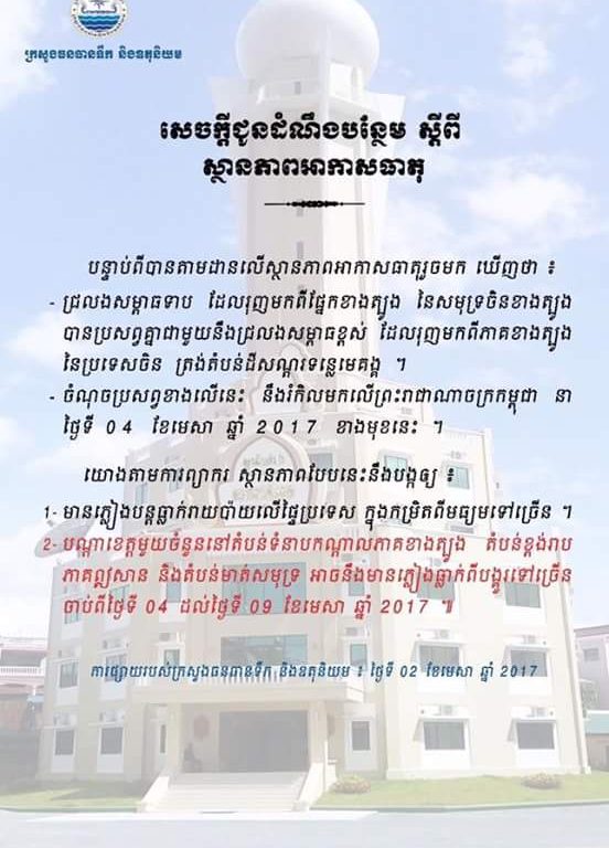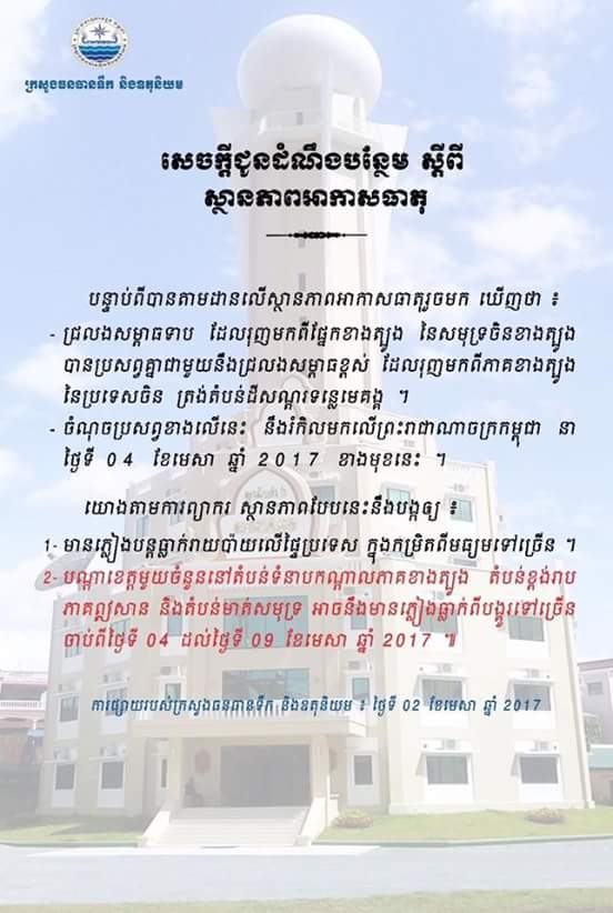 ព័ត៌មានថ្មី ក្រសួងធនធានទឹកចេញសេចក្តីជូនដំណឹងបន្ថែម ស្តីពី ស្ថានភាពអាកាសធាតុ ចែករំលែក៖ភ្នំពេញ ៖ ភ្លៀងនឹងបន្តធ្លាក់រាយប៉ាយក្នុងក្របខ័ណ្ឌទូទាំងប្រទេស ពិសេសចាប់ពីថ្ងៃទី ០៤ ដល់ថ្ងៃទី ០៩ ខែមេសា ឆ្នាំ ២០១៧ បណ្តាខេត្តមួយចំនួននឹងមានភ្លៀងធ្លាក់ពីបង្គួរទៅច្រើន ៕ ចែករំលែក៖