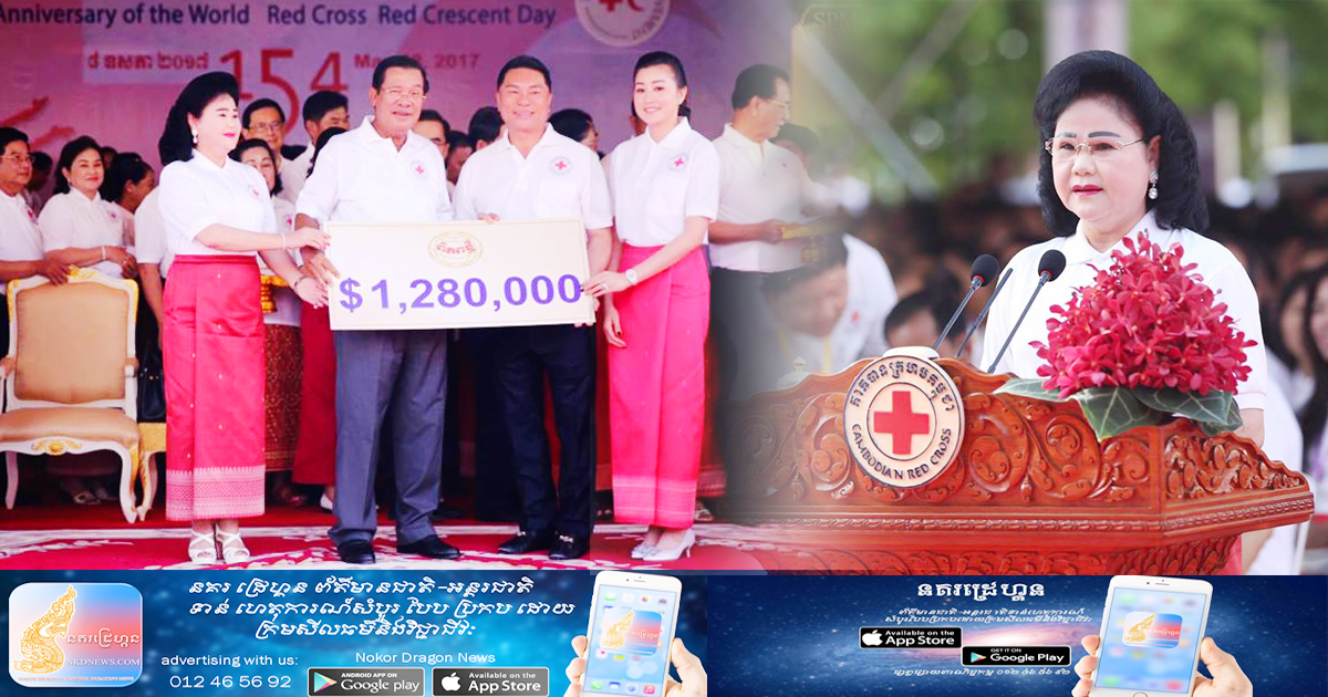 ភ្នំពេញ ៖ នៅព្រឹកថ្ងៃទី០៨ ខែឧសភា ឆ្នាំ២០១៧នេះ សម្តេចតេជោ ហ៊ុន សែន នាយករដ្ឋមន្រ្តីនៃព្រះរាជាណាចក្រកម្ពុជា និង សម្តេចកិត្តិព្រឹទ្ធបណ្ឌិត ប៊ុន រ៉ានី ហ៊ុនសែន ប្រធានកាកបាទក្រហមកម្ពុជា បានអញ្ជើញជាអធិបតីប្រារព្ធទិវាពិភពលោកកាកបាទក្រហម អឌ្ឍចន្ទក្រហម ៨ ឧសភា ដើម្បីរៃអង្គាសថវិកាដើម្បីទ្រទ្រង់សកម្មភាពការងារមនុស្សធម៌របស់កាកបាទក្រហមកម្ពុជា។