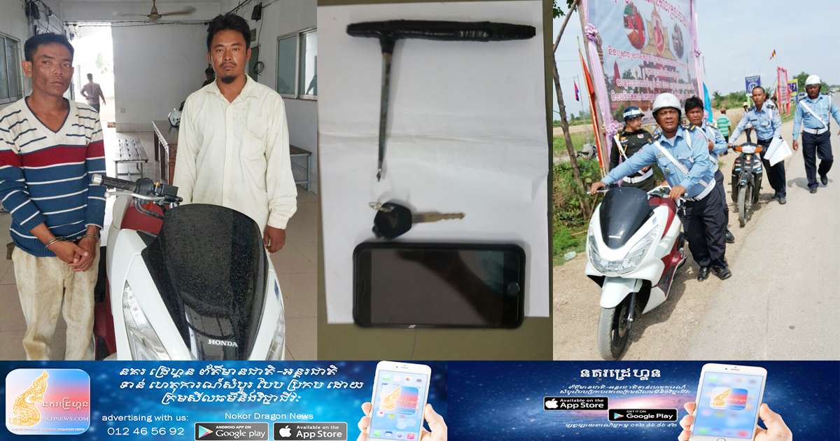 ខេត្តបន្ទាយមានជ័យ ៖  ជនសង្ស័យ២នាក់រងការបង្រ្កាបចាប់ឃាត់ខ្លួនពីកម្លាំងនគរបាលក្រុងប៉ោយប៉ែត ក្រោយពីពួកគេបានចូលទៅក្នុងវត្តស្ទឹងបត់ធ្វើសកម្មភាពកាច់សោកម៉ូតូ១គ្រឿងម៉ាកPCX ស៊េរីឆ្នាំ២០១៥ មានតម្លៃ៤ពាន់ដូល្លា ខណៈដែលម្ចាស់ចាក់សោកម៉ូតូ ទៅចូលរួមក្នុងកម្មពិធីបុណ្យឆ្លងព្រះវិហារ  កាលពីវេលាម៉ោង១០ព្រឹកថ្ងៃទី៩ ខែឧសភា ឆ្នាំ២០១៧ ស្ថិតនៅភូមិស្ទឹងបត់ សង្កាត់ផ្សារកណ្តាល ក្រុងប៉ោយប៉ែត ខេត្តបន្ទាយមានជ័យ។