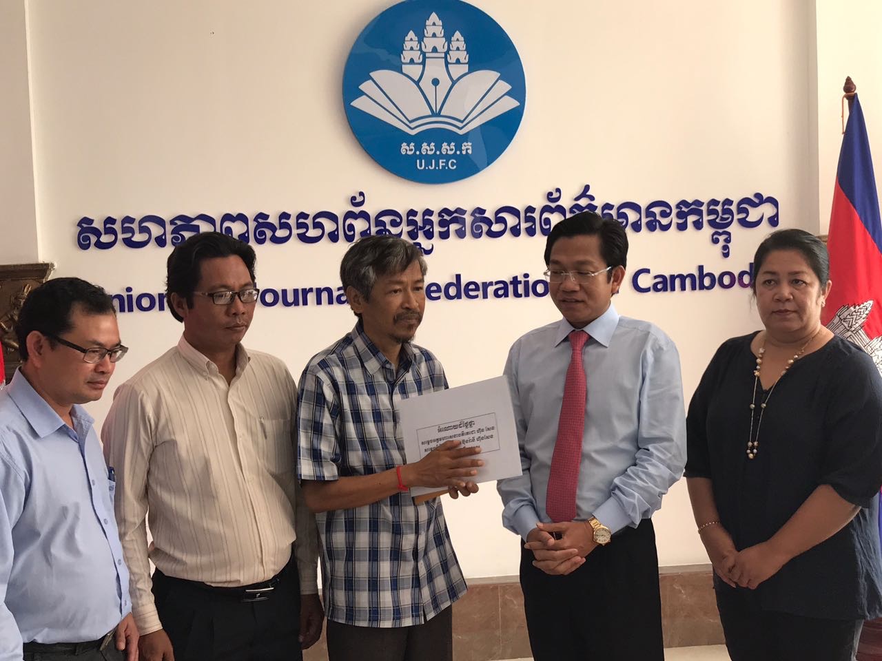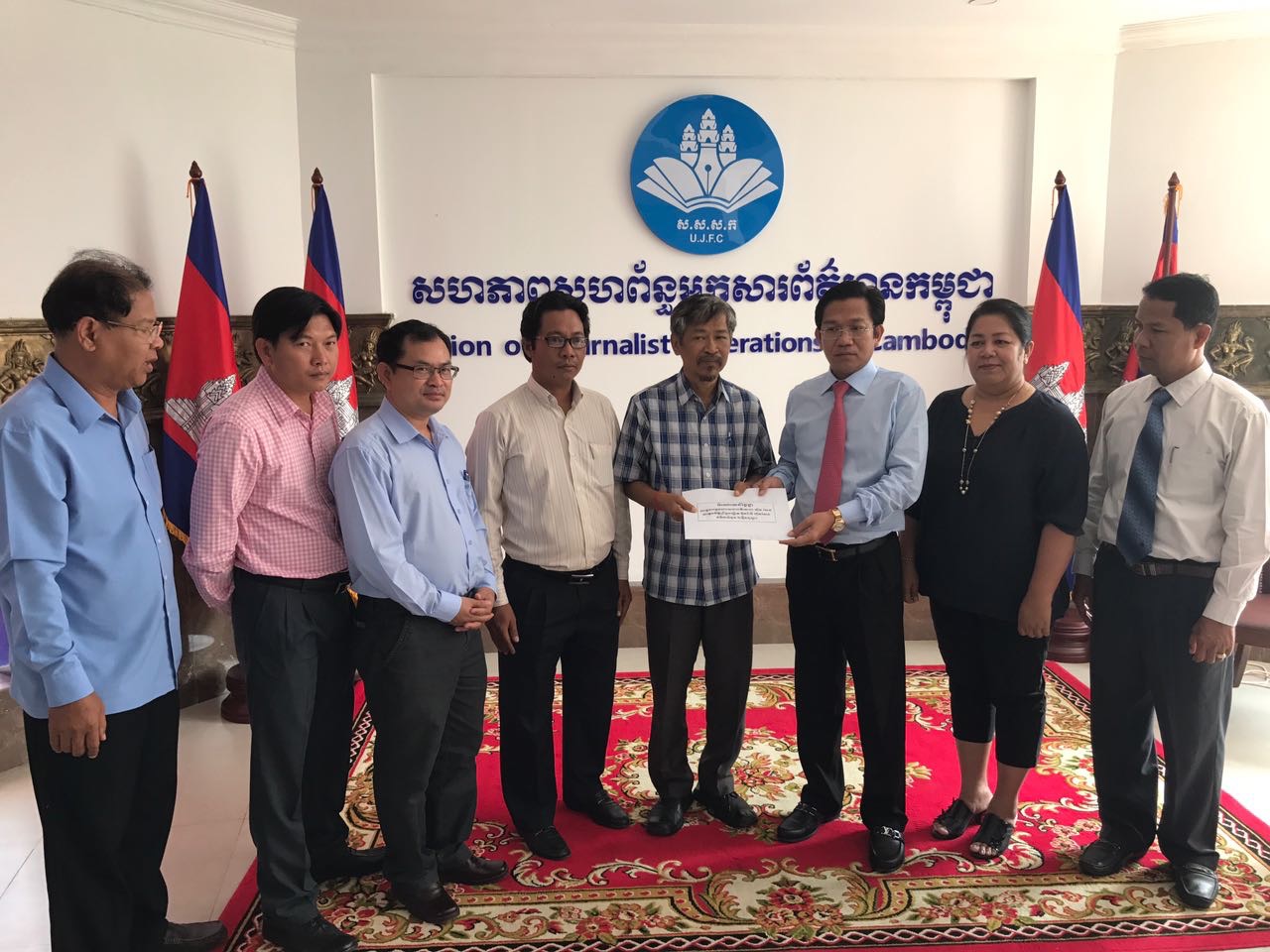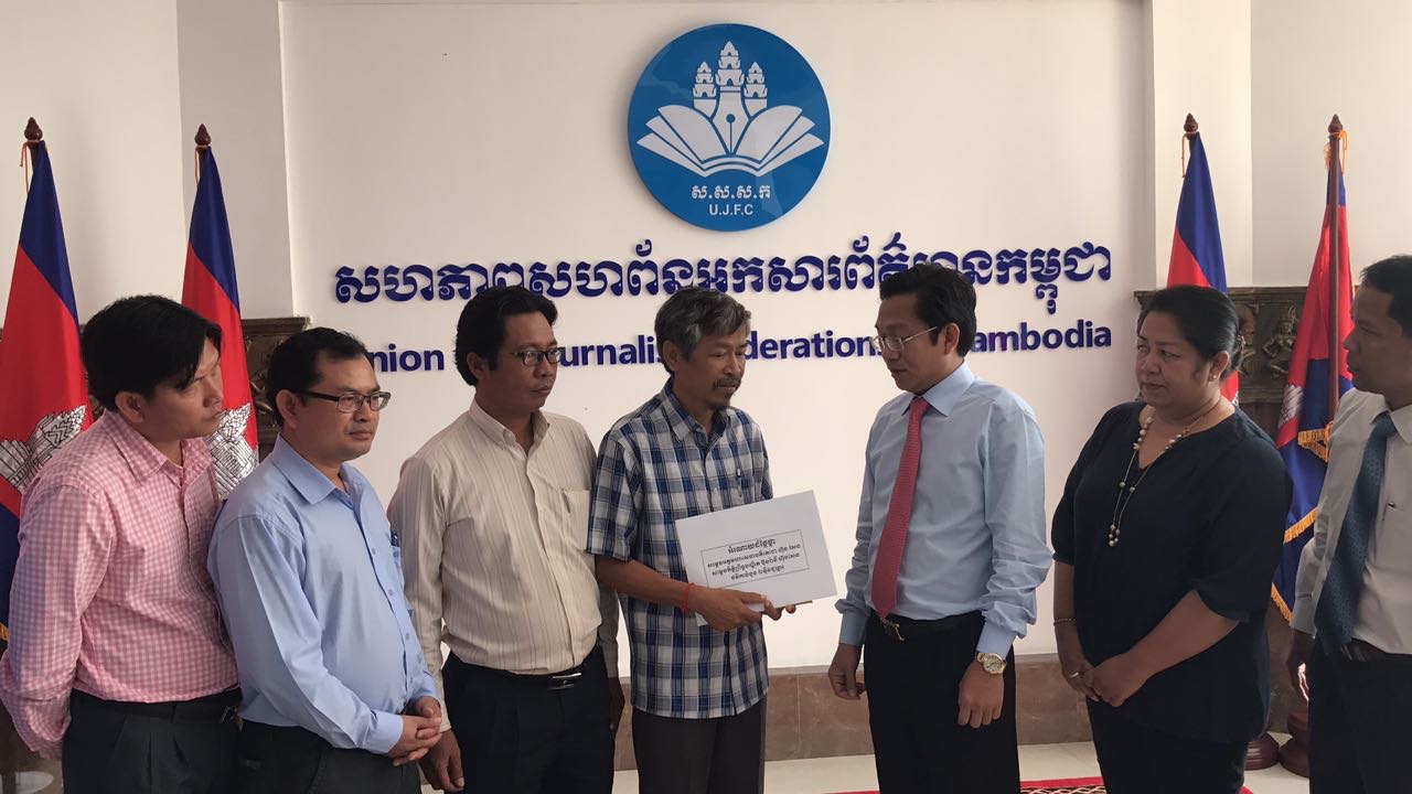 ភ្នំពេញ៖ នៅព្រឹកថ្ងៃទី១០ ខែឧសភា ឆ្នាំ២០១៧នេះ លោក ហ៊ុយ វណ្ណះ ប្រធានសហភាពសហព័ន្ធអ្នកសារព័ត៌មានកម្ពុជា (ស.ស.ស.ក) បានធ្វើពិធីប្រគល់ ថវិការបស់សម្តេចតេជោ ហ៊ុន សែន និង សម្តេចកិត្តិព្រឹទ្ធបណ្ឌិត ចំនួន២ម៉ឺនដុល្លារ ជូនអ្នកសារព័ត៌មាន ១រូបគឺលោក សាំង សុឥន្ទរិទ្ធ អតីតអ្នកកាសែត The Cambodia Daily ធ្វើនៅស្នាក់ការកណ្តាល ស.ស.ស.ក ។