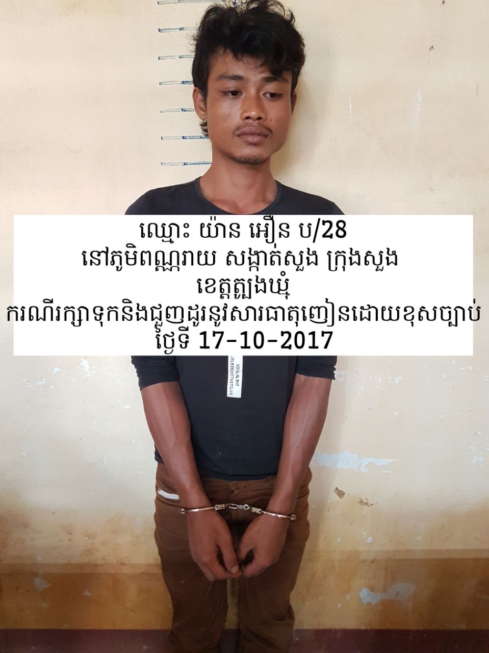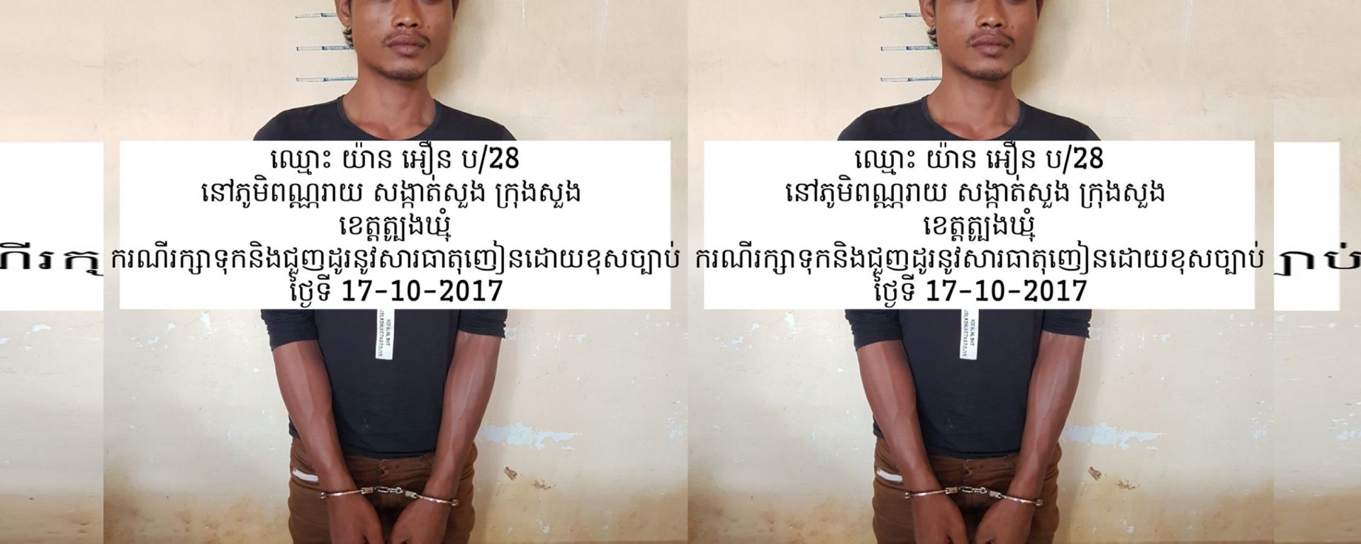 ខេត្តត្បូងឃ្មុំ ៖ កំលាំងជំនាញប្រឆាំងគ្រឿងញៀននៃ អធិការនគរបាលក្រុងសួងបានចុះឃាត់ ខ្លួនជនសង្ស័យម្នាក់ ពាក់ព័ន្ធរក្សាទុកនិងជួញដូរនូវសារធាតុញៀនដោយខុសច្បាប់ ធ្វើឡើង កាលពីវេលាម៉ោង៨និង៤០នាទី ថ្ងៃទី១៧ ខែតុលា ឆ្នាំ២០១៧ នៅនៅចំណុច ភូមិ ពណ្ណរាយ សង្កាត់សួង ក្រុងសួង ខេត្តត្បូងឃ្មុំ ។