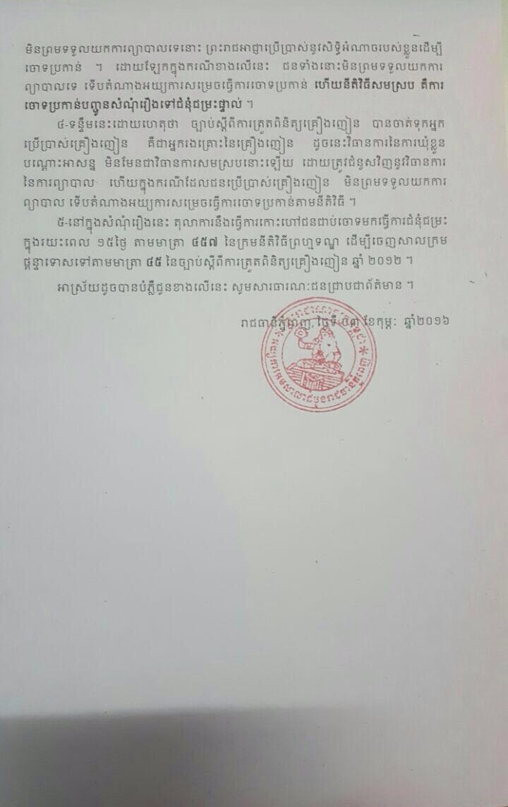 ព័ត៌មានថ្មី លោក អ៊ុំ សុភក្តី ព្រះរាជអាជ្ញារង នៃអយ្យការអមសាលាដំបូងរាជធានីភ្នំពេញចេញសេចក្តីបំភ្លឺ ជុំវិញព័ត៍មានផ្សព្វផ្សាយថាមានដោះលែងមុខសញ្ញាគ្រឿងញៀន ២៥នាក់ ចាត់ទុកថាជារឿងមិនពិត ចែករំលែក៖ ចែករំលែក៖