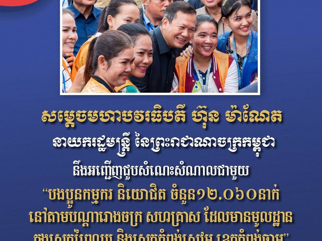 ភ្នំពេញ ៖ ព្រឹកស្អែក សម្តេចមហាបវរធិបតី ហ៊ុន ម៉ាណែត នាយករដ្ឋមន្ត្រី នៃព្រះរាជាណាចក្រកម្ពុជា នឹងអញ្ជើញជួបសំណេះសំណាលជាមួយបងប្អូនកម្មករ និយោជិត​ ចំនួន​​ ១២.០៦០នាក់ នៅតាមបណ្តារោងចក្រ សហគ្រាស ដែលមានមូលដ្ឋានស្ថិតនៅក្នុងស្រុកព្រៃឈរ និងស្រុកកំពង់សៀម ខេត្តកំពង់ចាម។