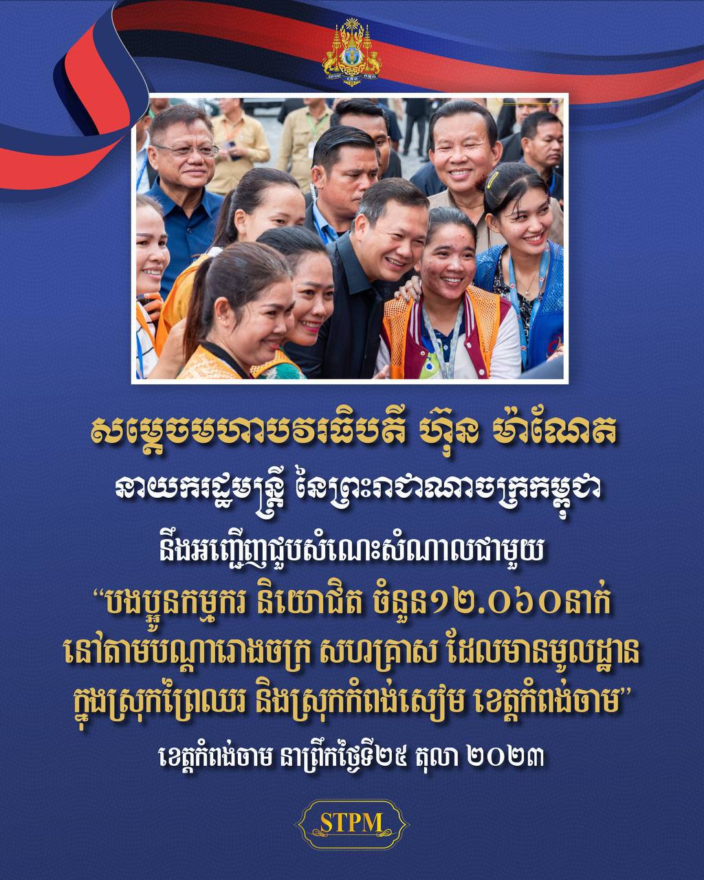ព្រឹកស្អែក សម្តេចមហាបវរធិបតី ហ៊ុន ម៉ាណែត នឹងអញ្ជើញជួបសំណេះសំណាលជាមួយបងប្អូនកម្មករ និយោជិត​ ចំនួន​​ ១២.០៦០នាក់ នៅក្នុងស្រុកព្រៃឈរ និងស្រុកកំពង់សៀម ខេត្តកំពង់ចាម