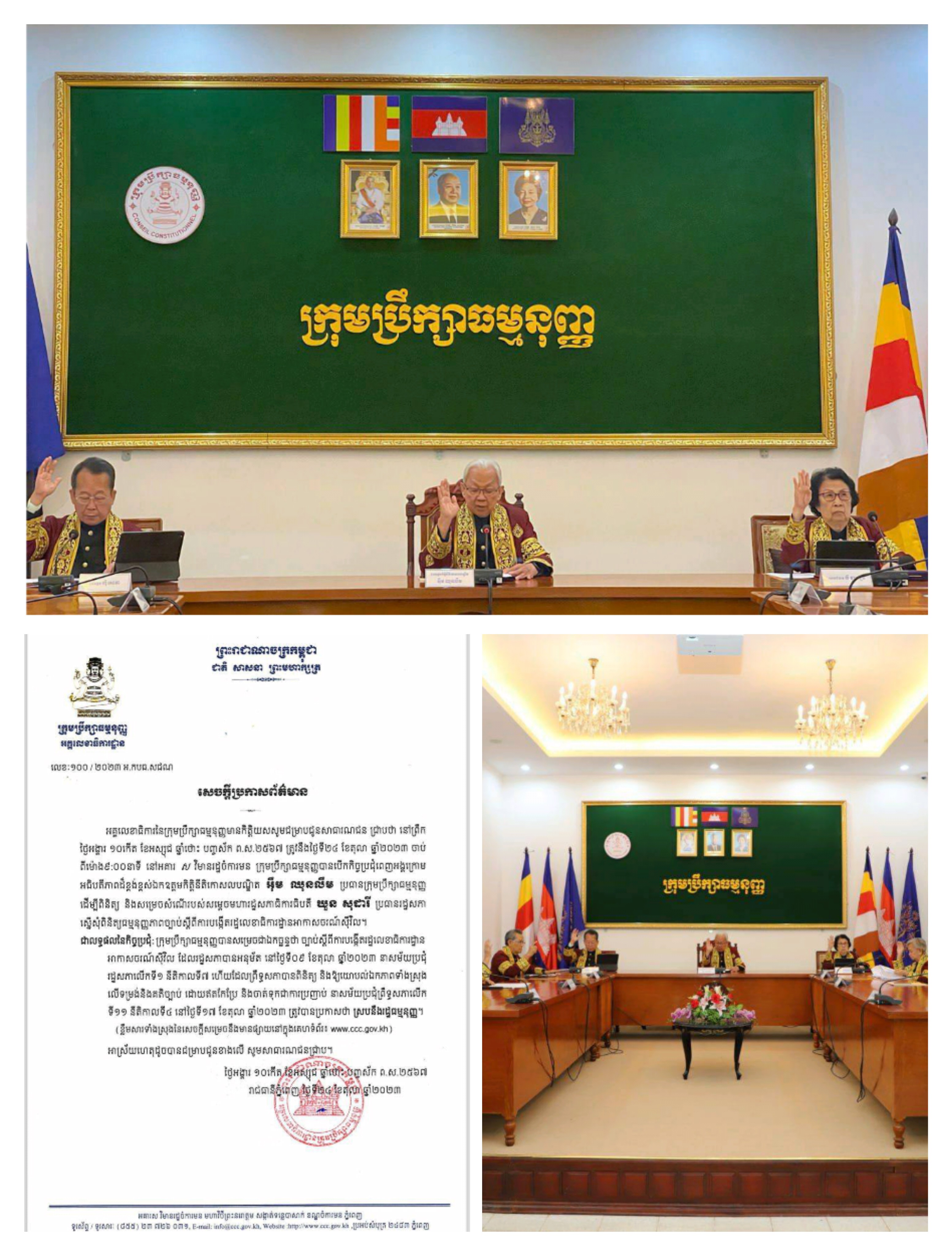 ភ្នំពេញ ៖ អគ្គលេខាធិការនៃក្រុមប្រឹក្សាធម្មនុញ្ញមានកិត្តិយសសូមជម្រាបជូនសាធារណជន ជ្រាបថា នៅព្រឹក ថ្ងៃអង្គារ ១០កើត ខែអស្សុជ ឆ្នាំថោះ បញ្ចស័ក ព.ស.២៥៦៧ ត្រូវនឹងថ្ងៃទី២៤ ខែតុលា ឆ្នាំ២០២៣ ចាប់ ពីម៉ោង៩:០០នាទី នៅអគារ ស វិមានរដ្ឋចំការមន ក្រុមប្រឹក្សាធម្មនុញ្ញបានបើកកិច្ចប្រជុំពេញអង្គក្រោម អធិបតីភាពដ៏ខ្ពង់ខ្ពស់ លោកកិត្តិនីតិកោសលបណ្ឌិត ហ៊ឹម ឈុនលឹម ប្រធានក្រុមប្រឹក្សាធម្មនុញ្ញ ដើម្បីពិនិត្យ និងសម្រេចសំណើរបស់សម្តេចមហារដ្ឋសភាធិការធិបតី ឃួន សុដារី ប្រធានរដ្ឋសភា ស្នើសុំពិនិត្យធម្មនុញ្ញភាពច្បាប់ស្តីពីការបង្កើតរដ្ឋលេខាធិការដ្ឋានអាកាសចរណ៍ស៊ីវិល។