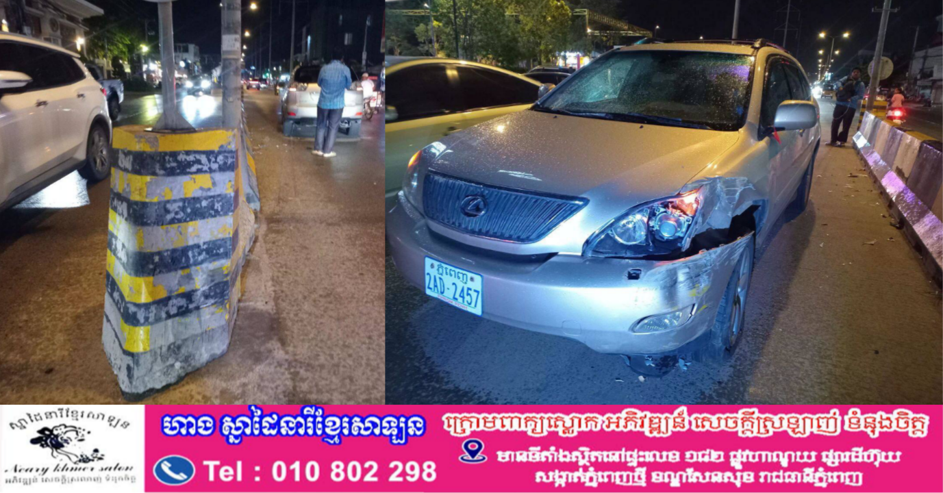 ភ្នំពេញ៖ បុរសវ័យចំណាស់ម្នាក់បើករថយន្ត Lexus rx 330 គ្រឿងបានរេចង្កូតទៅបុករបាំងថ្មពុះចែកទ្រូង់ផ្លូវបណ្ដាលឲ្យវៀចអស់មួយកង់ ឯរថយន្តខូចខាតផ្នែកខាងមុខនឹងបែកកង់ទៅមកលេខរួច។