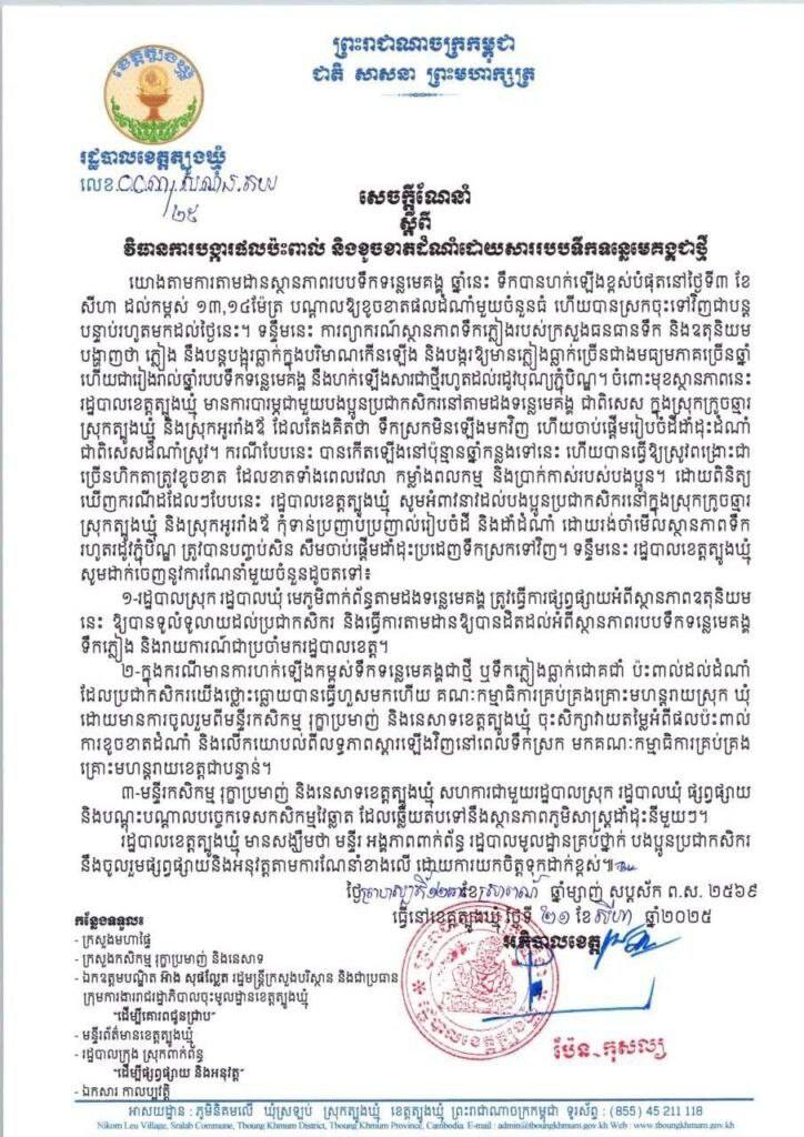 ១-រដ្ឋបាលស្រុក រដ្ឋបាលឃុំ មេភូមិពាក់ព័ន្ធតាមដងទន្លេមេគង្គ ត្រូវធ្វើក ត្រូវធ្វើការផ្សព្វផ្សាយអំពីស្ថានភាពឧតុនិយម នេះ ឱ្យបានទូលំទូលាយដល់ប្រជាកសិករ និងធ្វើការតាមដានឱ្យបានដិតដល់អំពីស្ថានភាពរបបទឹកទន្លេមេគង្គ ទឹកភ្លៀង និងរាយការណ៍ជាប្រចាំមករដ្ឋបាលខេត្ត។