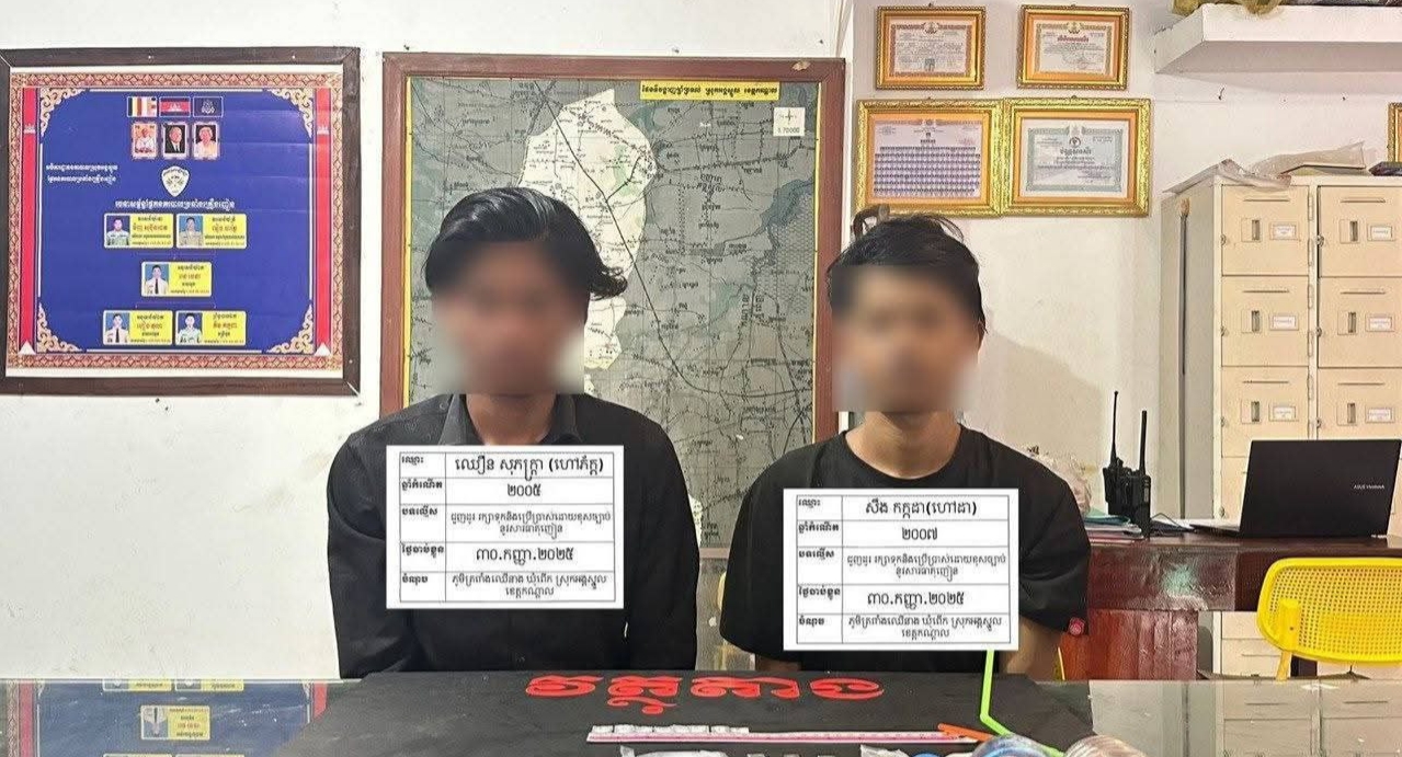 ខេត្តកណ្តាល÷ យុវជន ២នាក់ត្រូវបានកម្លាំងនគរបាលស្រុកអង្គស្នួលឃាត់ខ្លួនបាន ក្រោយសកម្មភាពជួញដូរ និងប្រើប្រាស់គ្រឿងញៀនរបស់ពួកគេត្រូវបានបែក ធ្លាយ។ ការឃាត់ខ្លួននេះបានធ្វើឡើងនៅព្រឹកថ្ងៃទី៣០ ខែកញ្ញា ឆ្នាំ២០២៥ នៅផ្ទះទុកចោលមួយកន្លែងក្នុងភូមិត្រពាំងឈើនាង ឃុំពើក ស្រុកអង្គស្នួល ខេត្តកណ្ដាល។