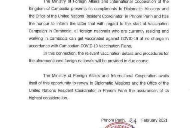 ជនបរទេសដែលស្នាក់នៅ និងធ្វើការនៅកម្ពុជា នឹងទទួលបានការចាក់វ៉ាក់សាំងកូវីដ-១៩ ដោយឥតគិតថ្លៃ