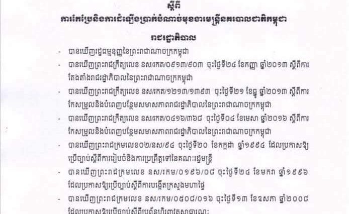 អនុក្រឹត្យលេខ ៣៤ អនក្រ.បក ចុះថ្ងៃចន្ទ ១១រោច ខែផល្គុន ឆ្នាំរកា ព.ស២៥៦១ ត្រូវនឹងថ្ងៃទី១២ ខែមីនា … អានបន្ថែម អនុក្រឹត្យ ស្តីពីការកែប្រែនិងការដំឡើងប្រាក់បំណាច់មុខងារមន្រ្តីនគរបាលជាតិកម្ពុជា