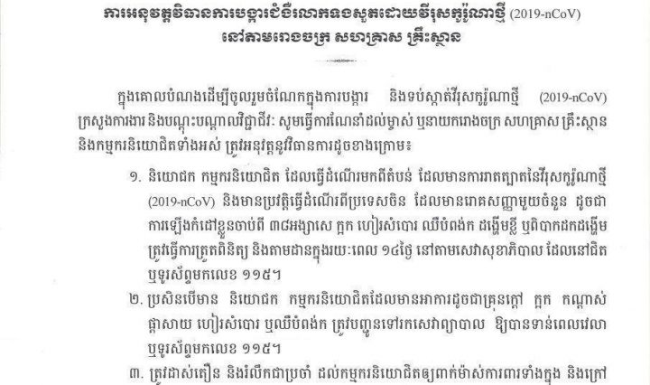 ភ្នំពេញ៖ ខណៈការរីករាលដាលជំងឺរលាកផ្លូវដង្ហើមប្រភេទថ្មី ដែលបង្កដោយវីរុសកូរ៉ូណា (2019-nCoV) នៅទូទាំងពិភពលោក ក្រសួងការងារ និងបណ្ដុះបណ្ដាលវិជ្ជាជីវៈនៃព្រះរាជាណាចក្រកម្ពុជា នៅថ្ងៃ បានចេញសេចក្ដីណែនាំស្ដីពីការអនុវត្តវិធានការចំនួន ១១ចំណុច ដើម្បីបង្ការជំងឺរលាកផ្លូវដង្ហើមប្រភេទថ្មីនេះ … អានបន្ថែម ក្រសួងការងារចេញសេចក្ដីណែនាំស្ដីពីការអនុវត្តវិធានការចំនួន ១១ចំណុច ដើម្បីបង្ការជំងឺរលាកផ្លូវដង្ហើមប្រភេទថ្មី