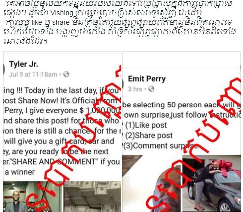 ភ្នំពេញ៖ នាយកដ្ឋានប្រឆាំបទល្មើសបច្ចេកវិទ្យា បានប្រកាសមុននេះបន្តិចឲ្យដឹងថា៖ «សូមបងប្អូនមានការប្រុងប្រយ័ត្ន ចំពោះការផ្សព្វផ្សាយ ដូចជាការឈ្នះរង្វាន់ផ្សេងៗតាមប្រព័ន្ធ បណ្តាញសង្គម ដូចជា Facebook ឬ … អានបន្ថែម នាយកដ្ឋានប្រឆាំងបទល្មើសប្រកាសឲ្យអ្នកលេងហ្វេសប៊ុកប្រយ័ត្នចាញ់បោក