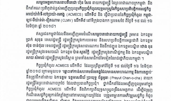 សម្តេចតេជោ ហ៊ុន សែន នឹងដឹកនាំប្រតិភូជាន់ខ្ពស់កម្ពុជា អញ្ជើញចូលរួមកិច្ចប្រជុំកំពូលយុទ្ធសាស្ត្រនៃកិច្ចសហប្រតិបត្តិការសេដ្ឋកិច្ចអាយ៉េយ៉ារ៉ាឌី ចៅ ប្រាយ៉ា-មេគង្គ (ACMECS) លើកទី៨ នៅប្រទេសថៃ ពីថ្ងៃទី១៥-១៦ មិថុនា ខាងមុខ