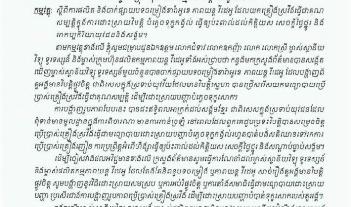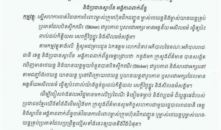 លិខិតរដ្ឋមន្ត្រីក្រសួងព័ត៌មាន ជម្រាបជូនលោក លោកស្រី អភិបាល នៃគណៈអភិបាលរាជធានី ខេត្ត និងប្រធានស្ថាប័ន អង្គភាពពាក់ព័ន្ធ ស្នើសហការចាត់វិធានការចំពោះម្ចាស់ក្រុមហ៊ុនដឹកជញ្ជូន ម្ចាស់រថយន្ត និងម្ចាស់យានយន្តគ្រប់ប្រភេទដែលបិទស្ទីកឃើរ ជារូបភាព ឬជាសារជាអក្សរ មានអត្ថន័យ អសីលធម៌ ធ្វើឲ្យប៉ះពាល់ដល់កិត្តិយស សេចក្តីថ្លៃថ្នូរ និងសីលធម៌សង្គម៖
