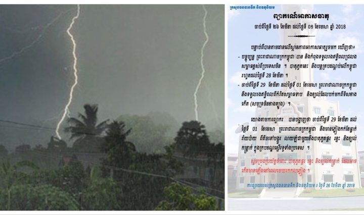 ភ្នំពេញ ៖ ក្រសួងធនធានទឹកបានបញ្ជាក់ថា «យោងតាមការព្យាករ បានបង្ហាញថា ចាប់ពីថ្ងៃទី២៩ ខែមីនា ដល់ថ្ងៃទី០១ ខែមេសា កម្ពុជា … អានបន្ថែម ក្រសួងធនធានទឹក ៖ ចាប់ពីថ្ងៃទី២៩ ខែមីនា ដល់ថ្ងៃទី០១ ខែមេសា កម្ពុជា នឹងមានភ្លៀងកក់ខែធ្លាក់ រ៉ាយប៉ាយ ពីតិចទៅបង្គួរ លាយឡំជាមួយនឹងបាតុភូតផ្គរ រន្ទះ និងខ្យល់ កន្ដ្រាក់ ក្នុងក្របខណ្ឌស្ទើរទូទាំងប្រទេស