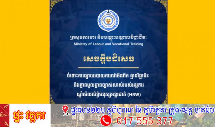 ក្រសួងការងារ បដិសេធ និងថ្កោលទោសចំពោះការផ្សាយរបាយការណ៍មិនពិត គ្មានវិជ្ជាជីវៈ និងគ្មានមូលដ្ឋានច្បាស់លាស់របស់អង្គការឃ្លាំមើលសិទ្ធិមនុស្សអន្តរជាតិ (HRW) កាលពីថ្ងៃទី២៥ ខែវិច្ឆិកា ឆ្នាំ២០២៥