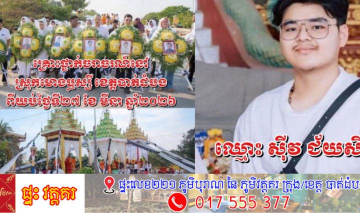 ខេត្តបាត់ដំបង៖ ស្នងការដ្ឋាននគរបាលខេត្តបាត់ដំបង បានបង្ហាញការសន្និដ្ឋានថា បុគ្គលឈ្មោះ ស៊ីវ ជ័យសិដ្ឋ អាយុ ២០ឆ្នាំ ពិតជាអ្នកបើករថយន្តបុកម៉ូតូបណ្តាលឱ្យស្លាប់មនុស្ស៦នាក់ រួមទាំងកូនក្នុងផ្ទៃអាយុ៣ខែ។ … អានបន្ថែម ស្នងការដ្ឋាននគរបាលខេត្តបាត់ដំបង សន្និដ្ឋានថា បុគ្គលឈ្មោះ ស៊ីវ ជ័យសិដ្ឋ ពិតជាអ្នកបើករថយន្តបុកម៉ូតូ, ឪពុកប្រាប់សមត្ថកិច្ចថា កូនទាក់ទងមិនបាន ហើយមិនដឹងទៅលាក់ខ្លួននៅទីណា?