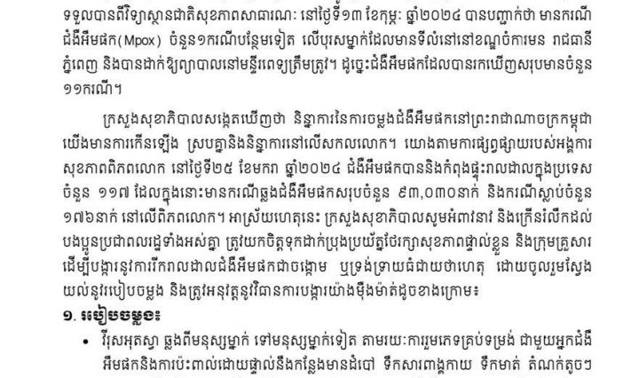 ក្រសួងសុខាភិបាល ចេញសេចក្តីប្រកាសព័ត៌មាន ស្តីពីការរកឃើញជំងឺអុតស្វា (Mpox) លើបុរសម្នាក់ទៀតនៅរាជធានីភ្នំពេញ ដែលជាករណីទី១១