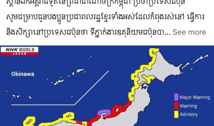 ភ្នំពេញ៖ ស្ថានឯកអគ្គរាជទូតនៃព្រះរាជាណាចក្រកម្ពុជា ប្រចាំប្រទេសជប៉ុន បានជម្រាបជូនប្រជាពលរដ្ឋខ្មែរទាំងអស់ដែលកំពុងរស់នៅ ធ្វើការ និងសិក្សានៅប្រទេសជប៉ុនថា ទីភ្នាក់ងារឧតុនិយមជប៉ុនបានចេញសេចក្តីជូនដំណឹងអំពីគ្រោះរញ្ជួយដីដ៏ធំសម្បើមមួយ ( កំរិត7.4 ) … អានបន្ថែម ប្រជាពលរដ្ឋខ្មែរ ដែលកំពុងរស់នៅភាគកណ្តាលប្រទេសជប៉ុន សូមមានការប្រុងប្រយ័ត្នខ្ពស់ ខណៈនឹងមានគ្រោះរញ្ជួយដីដ៏ធំសម្បើមមួយ ( កំរិត7.4 ) នៅខេត្ត Ishikawa