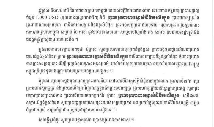 ភ្នំពេញ ៖ សម្ដេចកិត្តិព្រឹទ្ធបណ្ឌិត ប៊ុន រ៉ានី ហ៊ុនសែន ប្រធានកាកបាទក្រហមកម្ពុជា ក្រាបបង្គំទូលថ្វាយនូវសារលិខិតថ្លែងអំណរព្រះរាជគុណថ្វាយ ព្រះករុណា ព្រះបាទសម្តេចព្រះបរមនាថ … អានបន្ថែម សម្ដេចកិត្តិព្រឹទ្ធបណ្ឌិត ប៊ុន រ៉ានី ហ៊ុនសែន ក្រាបបង្គំទូលថ្វាយនូវសារលិខិតថ្លែងអំណរព្រះរាជគុណថ្វាយ ព្រះករុណា