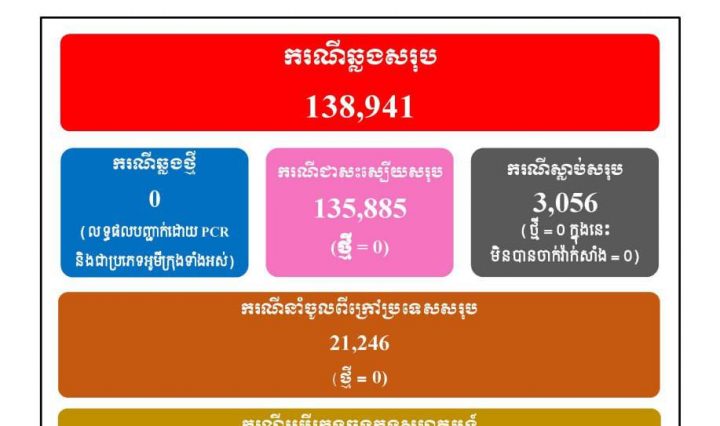 ភ្នំពេញ៖ បើយោងតាមសេចក្ដីជូនដំណឹងរបស់ក្រសួងសុខាភិបាលកម្ពុជា នៅថ្ងៃទី១០ ខែតុលា ឆ្នាំ២០២៣នេះ បានបញ្ជាក់ពីការរកឃើញករណីវិជ្ជមានវីរុសកូវីដ-១៩ថ្មី គ្មានអ្នកឆ្លងថ្មី , គ្មានឣ្នកជាសះស្បើយ ខណៈអ្នកជំងឺស្លាប់គ្មាន។ … អានបន្ថែម ថ្ងៃនេះ! ករណីឆ្លងកូវីដ-១៩៖ គ្មានអ្នកឆ្លងថ្មី , គ្មានអ្នកជាសះស្បើយ និងគ្មានអ្នកជំងឺស្លាប់