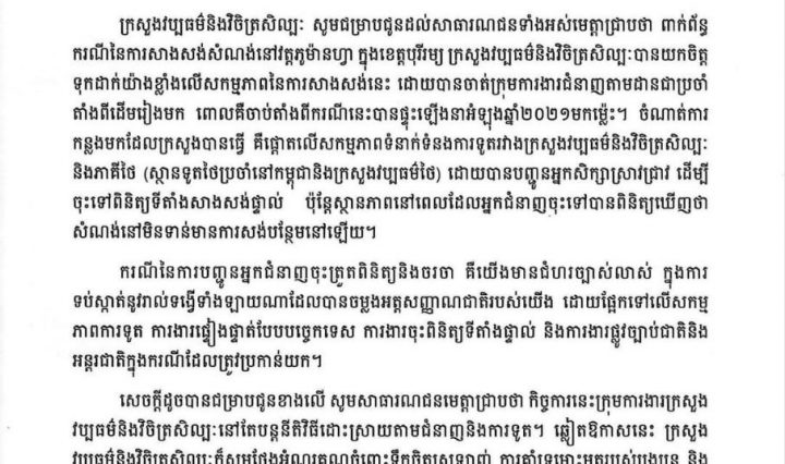 ក្រសួងវប្បធម៌ និងវិចិត្រសិល្បៈ ចេញសេចក្តីជូនដំណឹង ស្តីពី ការសាងសង់សំណង់នៅវត្តភូម៉ានហ្វា ខេត្តបុរីរម្យ