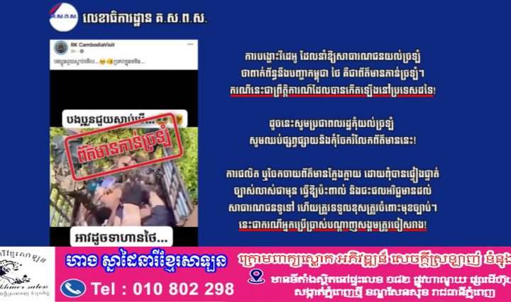 ភ្នំពេញ៖ លេខាធិការដ្ឋាន គ.ស.ព.ស បានឱ្យដឹងថា ការបង្ហោះវីដេអូ ដែលនាំឱ្យសាធារណជនយល់ច្រឡំថាពាក់ព័ន្ធនឹងបញ្ហាកម្ពុជា ថៃ គឺជាព័ត៌មានភាន់ច្រឡំ។ ករណីនេះជាព្រឹត្តិការណ៍ដែលបានកើតឡើងនៅប្រទេសដទៃ! ដូចនេះសូមប្រជាពលរដ្ឋកុំយល់ច្រឡំ … អានបន្ថែម ការបង្ហោះវីដេអូ ដែលនាំឱ្យសាធារណជនយល់ច្រឡំថាពាក់ព័ន្ធនឹងបញ្ហាកម្ពុជា ថៃ គឺជាព័ត៌មានភាន់ច្រឡំ។ ករណីនេះជាព្រឹត្តិការណ៍ដែលបានកើតឡើងនៅប្រទេសដទៃ!