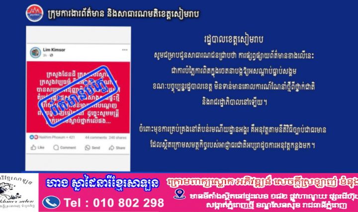 ខេត្តសៀមរាប ៖ រដ្ឋបាលខេត្តសៀមរាបសូមជម្រាបជូនសាធារណជនជ្រាបថា ការផ្សព្វផ្សាយព័ត៌មានខាងក្រោមនេះ ជាការបំភ្លៃការពិតក្នុងចេតនាបង្កឱ្យអសណ្តាប់ធ្នាប់សង្គម ខណៈបច្ចុប្បន្នរដ្ឋបាលខេត្ត មិនទាន់មានគោលការណ៍ណែនាំថ្មីពីថ្នាក់ជាតិ និងរាជរដ្ឋាភិបាលនៅឡើយ។ បច្ចុប្បន្នការគ្រប់គ្រងនៅតំបន់រមណីដ្ឋានអង្គរ គឺអនុវត្តតាមនីតិវិធីច្បាប់ជាធរមាន … អានបន្ថែម រដ្ឋបាលខេត្តសៀមរាប មានករណីផ្សព្វផ្សាយព័ត៌មានបំភ្លៃការពិតក្នុងចេតនាបង្កឱ្យអសណ្តាប់ធ្នាប់សង្គម