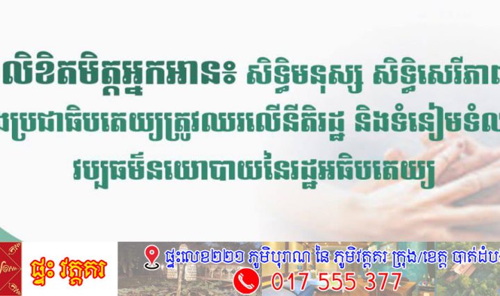 ភ្នំពេញ ៖ ថ្ងៃទី១០ ធ្នូ គឺពិតជាទិវាសិទ្ធិមនុស្សឣន្តរជាតិ ហើយដែលប្រទេសកម្ពុជាក្រោយមានកិច្ចព្រមព្រៀងសន្តិភាពក្រុងប៉ារីស ឆ្នាំ១៩៩១ គឺជាប្រទេសហត្ថលេខីមួយ នៃសេចក្តីថ្លែងការណ៍ជាសាកលរបស់ឣង្កការសហប្រជាជាតិ ស្តីពីសិទ្ធិមនុស្ស … អានបន្ថែម លិខិតមិត្តអ្នកអាន៖ សិទ្ធិមនុស្ស សិទ្ធិសេរីភាព និងប្រជាធិបតេយ្យត្រូវឈរលើនីតិរដ្ឋ និងទំនៀមទំលាប់វប្បធម៌នយោបាយនៃរដ្ឋឣធិបតេយ្យ