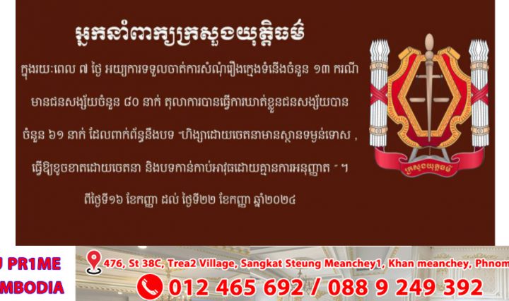 ខេត្តស្វាយរៀង:សមត្ថកិច្ច បញ្ជូនជនសង្ស័យ ប្រុសស្រី ៣នាក់ ជនជាតិវៀតណាម រួមជាមួយវត្ថុតាងទៅកាន់សាលាដំបូងខេត្ត នៅថ្ងៃទី២៤ខែកញ្ញាឆ្នាំ២០២៤ ករណីជួញដូរ រក្សាទុកប្រើប្រាស់ដោយខុសច្បាប់នូវសារធាតុញៀននិងកាន់កាប់រក្សាទុកអាវុធគ្រាប់រំសេវដោយគ្មានការអនុញ្ញាតនៅក្រុងបាវិត ។ … អានបន្ថែម សមត្ថកិច្ច បញ្ជូនជនសង្ស័យ ប្រុសស្រី ៣នាក់ ទៅកាន់សាលាដំបូងខេត្ត ករណីជួញដូរ រក្សាទុកប្រើប្រាស់ដោយខុសច្បាប់នូវសារធាតុញៀននិងកាន់កាប់រក្សាទុកអាវុធគ្រាប់រំសេវដោយគ្មានការអនុញ្ញាតនៅក្រុងបាវិត