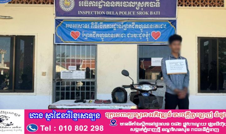 ខេត្តតាកែវ៖ អធិការដ្ឋាននគរបាលស្រុកបាទីបានឱ្យដឹងនៅថ្ងៃទី២៣ ខែសីហា ឆ្នាំ២០២៤នេះថា កម្លាំងសមត្ថកិច្ចជំនាញបានធ្វេីការឃាត់ខ្លួនជនសង្ស័យម្នាក់ពីបទជាប់ពាក់ព័ន្ធករណីកាន់កាប់ ឬដឹកជញ្ជូនអាវុធដោយគ្មានការអនុញ្ញាត និងករណីគំរាមកំហែង (ដោយប្រើប្រាស់អាវុធ) ។ … អានបន្ថែម យកកាំបិតភ្ជង់ប្លន់យកលុយពីជនរងគ្រោះគេចខ្លួនជិត១ខែសមត្ថកិច្ចស្រាវជ្រាវតាមចាប់មកវិញ