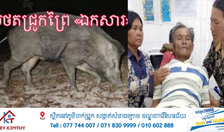 ខេត្តសៀមរាប ៖ នៅព្រឹកថ្ងៃទី១៤ ខែមិថុនា ឆ្នាំ២០២៤ ប្រហែលជាម៉ោង៧ជាង ជ្រូកព្រៃមួយក្បាលទម្ងន់ប្រហែល៧០គីឡូមិនដឹងមកពីណាទេបានខាំប្រជាជនម្នាក់ឈ្មោះឡី ឡៃ អាយុ៦៨ឆ្នាំរងរបួសជើងនិងដងខ្លួនពេលគាត់កំពុងជីកដីធ្វើរបងផ្ទះនៅចំកណ្តាលភូមិរុន ឃុំចន្លាស់ដៃ … អានបន្ថែម ព្រឹកមុិញ ! ជ្រូកព្រៃមួយក្បាលទម្ងន់ប្រហែល៧០គីឡូមិនដឹងមកពីណាទេបានខាំ បុរសវ័យប្រមាណជិតអាយុ ៧០ឆ្នាំ រងរបួសធ្ងន់