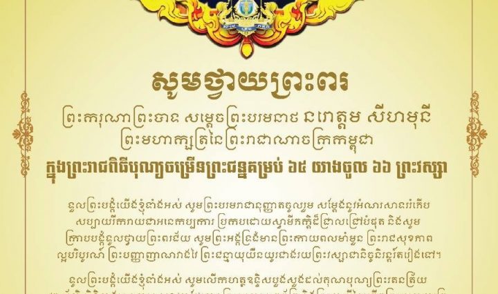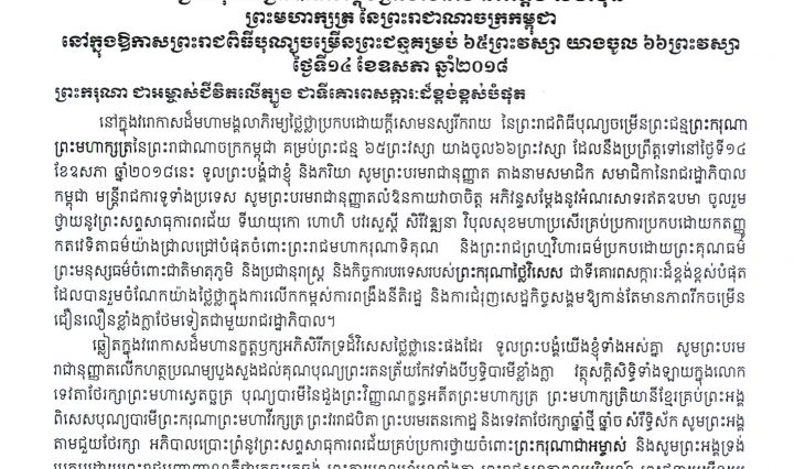 សារលិខិតថ្វាយព្រះពរ ព្រះករុណា ព្រះបាទសម្តេចព្រះបរមនាថ នរោត្តម សីហមុនី ព្រះមហាក្សត្រ នៃព្រះរាជាណាចក្រកម្ពុជា ក្នុងឱកាសព្រះរាជពិធីបុណ្យចម្រើនព្រះជន្មគម្រប់៦៥ យាងចូល ៦៦ព្រះវស្សា ថ្ងៃទី ១៤ ខែ ឧសភា ឆ្នាំ២០១៨