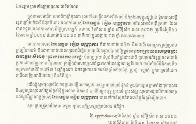 សារលិខិតរំលែកទុក្ខរបស់សម្តេចវិបុលសេនាភក្តី សាយ ឈុំប្រធានព្រឹទ្ធសភា ជូនឯកឧត្តម អៀវ បណ្ណាសិទ្ធ ព្រមទាំងក្រុមគ្រួសារ ចំពោះមរណៈភាពរបស់ឯកឧត្តម អៀវ បណ្ណាការ អតីតសមាជិកព្រឹទ្ធសភា ដែលបានទទួលមរណៈភាព កាលពីថ្ងៃទី១០ ខែឧសភា ឆ្នាំ២០១៨