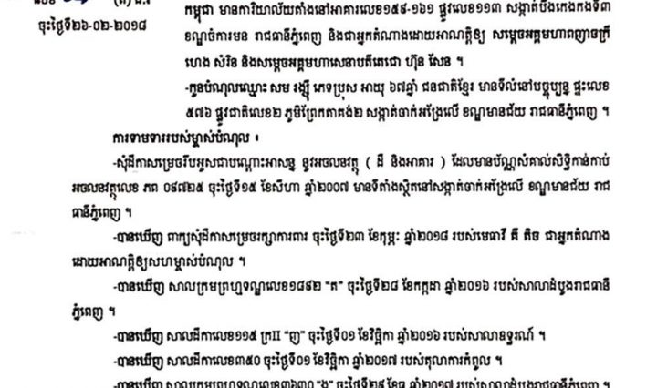 ភ្នំពេញ៖ នាព្រឹកថ្ងៃពុធ ទី២៨ ខែកុម្ភៈ ឆ្នាំ២០១៨ លោក សួន វិសាល ប្រធានគណៈមេធាវីនៃព្រះរាជាណាចក្រកម្ពុជា បានដឹកនាំប្រតិភូគណៈមេធាវី … អានបន្ថែម លោក សួន វិសាល ប្រធានគណៈមេធាវីនៃព្រះរាជាណាចក្រកម្ពុជា បានដឹកនាំប្រតិភូគណៈមេធាវី ជួបសម្តែងការគួរសមនិងពិភាក្សាលើកិច្ចសហប្រតិបត្តិការក្នុងវិស័យយុត្តិធម៌ ជាមួយលោក នាយឧត្តមសេនីយ៍ សៅ សុខា