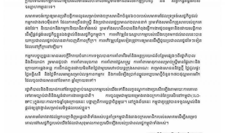 សមាគមរោងចក្រកាត់ដេរនៅកម្ពុជា GMAC អំពាវនាវឱ្យអ្នកបញ្ជាទិញអន្តរជាតិ បន្តគាំទ្រកម្ពុជា ហើយស្នើកុំឱ្យមានការបកស្រាយស្ថានភាពនយោបាយ ធ្វើប៉ះពាល់លើផលិតកម្មកាត់ដេរ